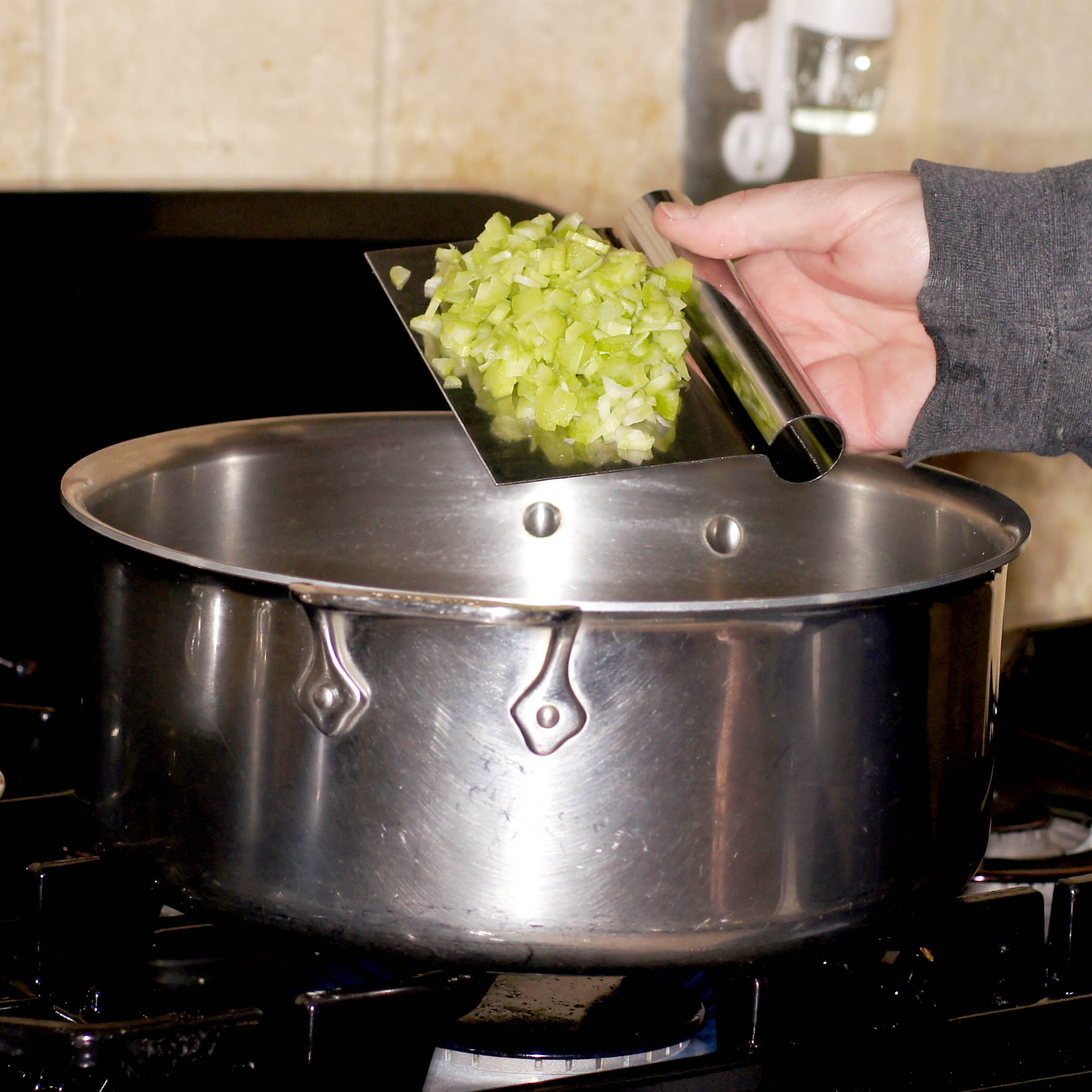 Sweat the veggies for 5 minutes or until the garlic becomes aromatic. Now add the chicken stock.