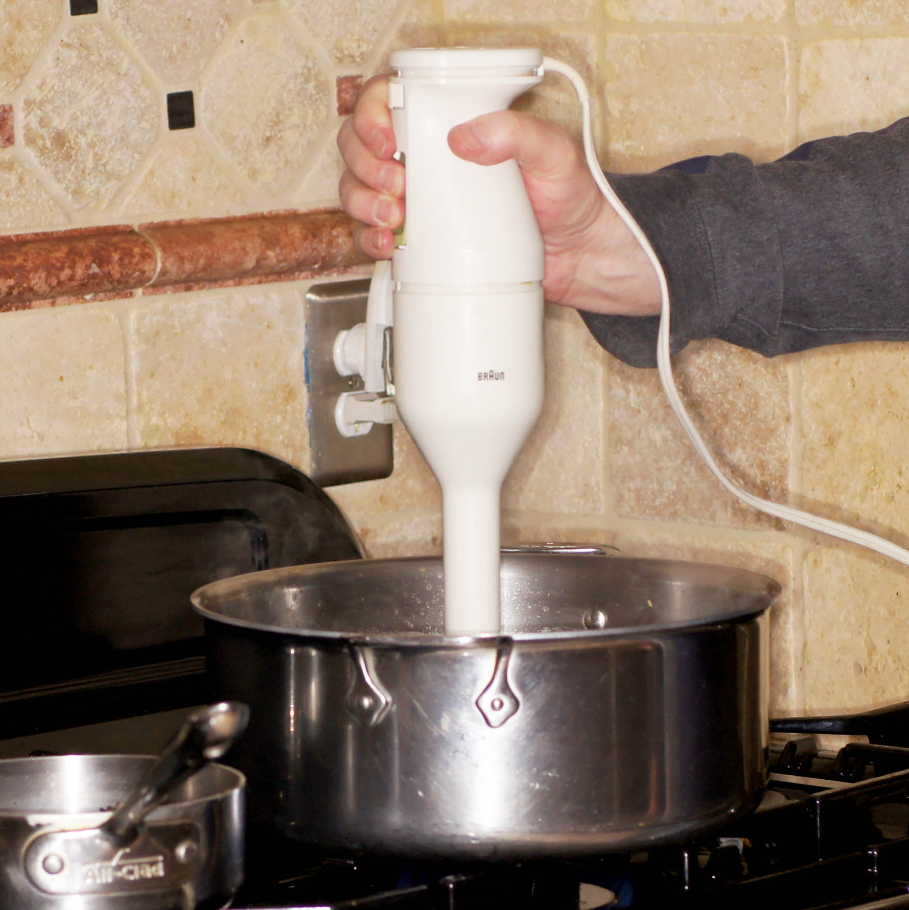 Next, remove the bones and, using an immersion blender, puree the veggies in the pot.