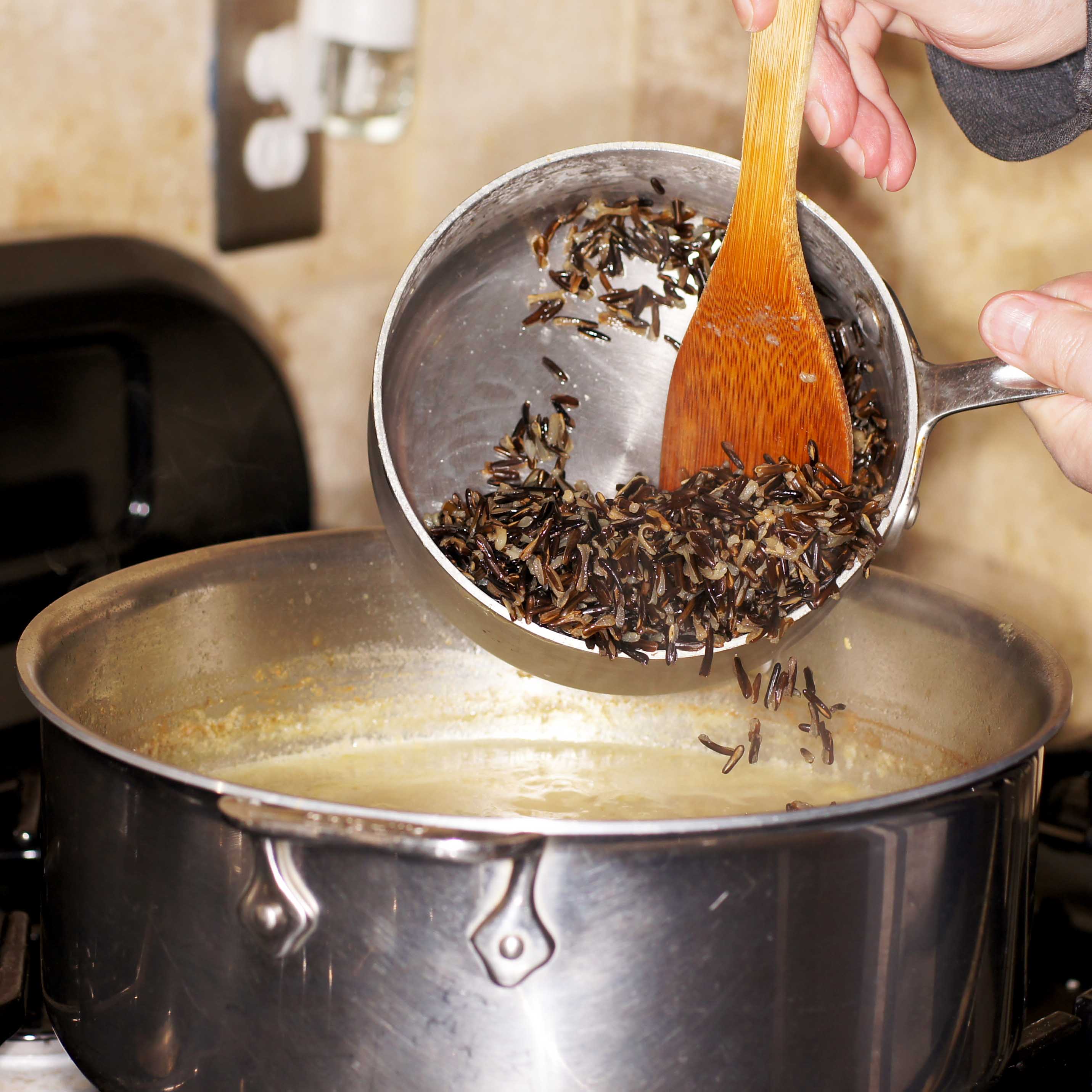 First thing first, steam the rice. Add 1-1/2 cups water, a pitch of salt and 1/2 cup wild rice to a small pot. Bring to a boil, reduce to a simmer, cover and cook for 30 minutes or until tender and the water is absorbed.