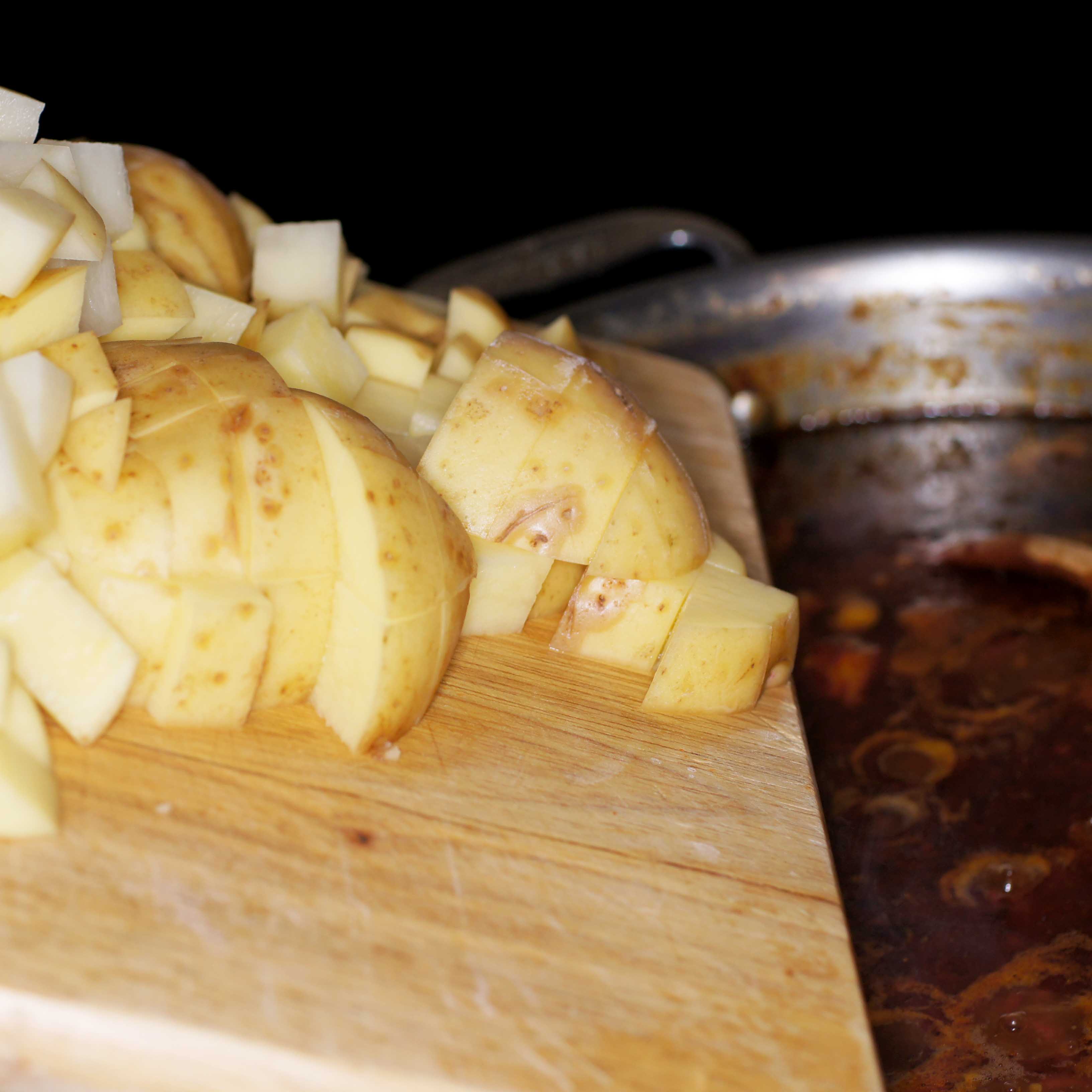 Allow this to cook over medium heat, stirring occasionally, for 1 to 1-1/2 hours until the pork is tender. You want this to reduce and thicken, as well. If it gets too low on liquid either add more stock or water. Now add the potatoes.