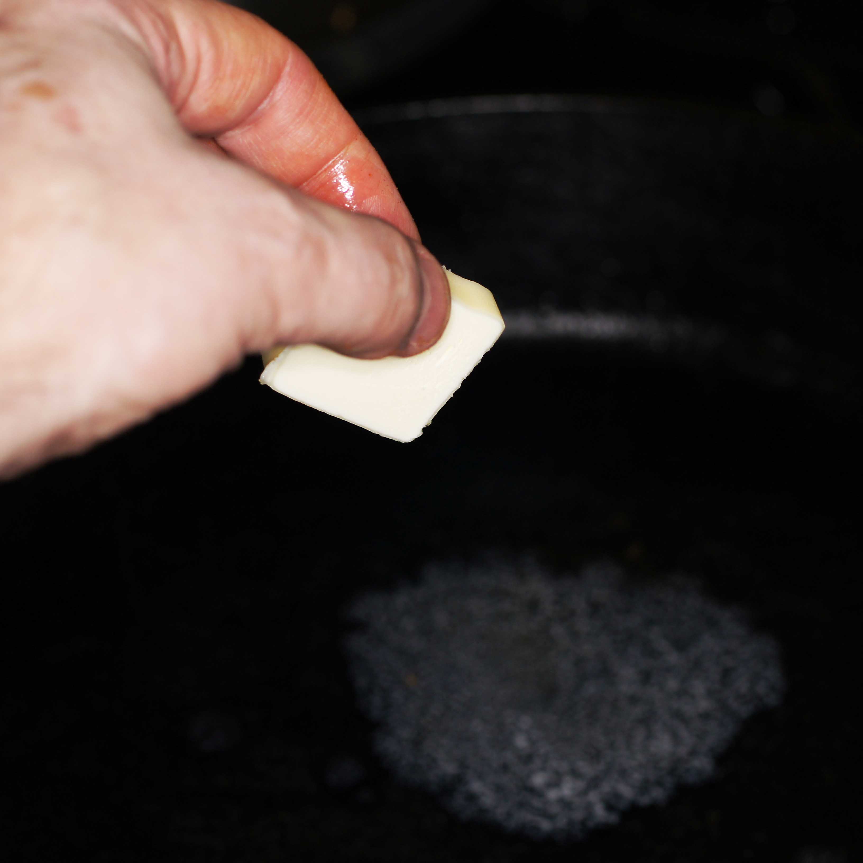 While the oven is heating, preheat a cast iron pan over high heat. Brush each side of the steak with butter.