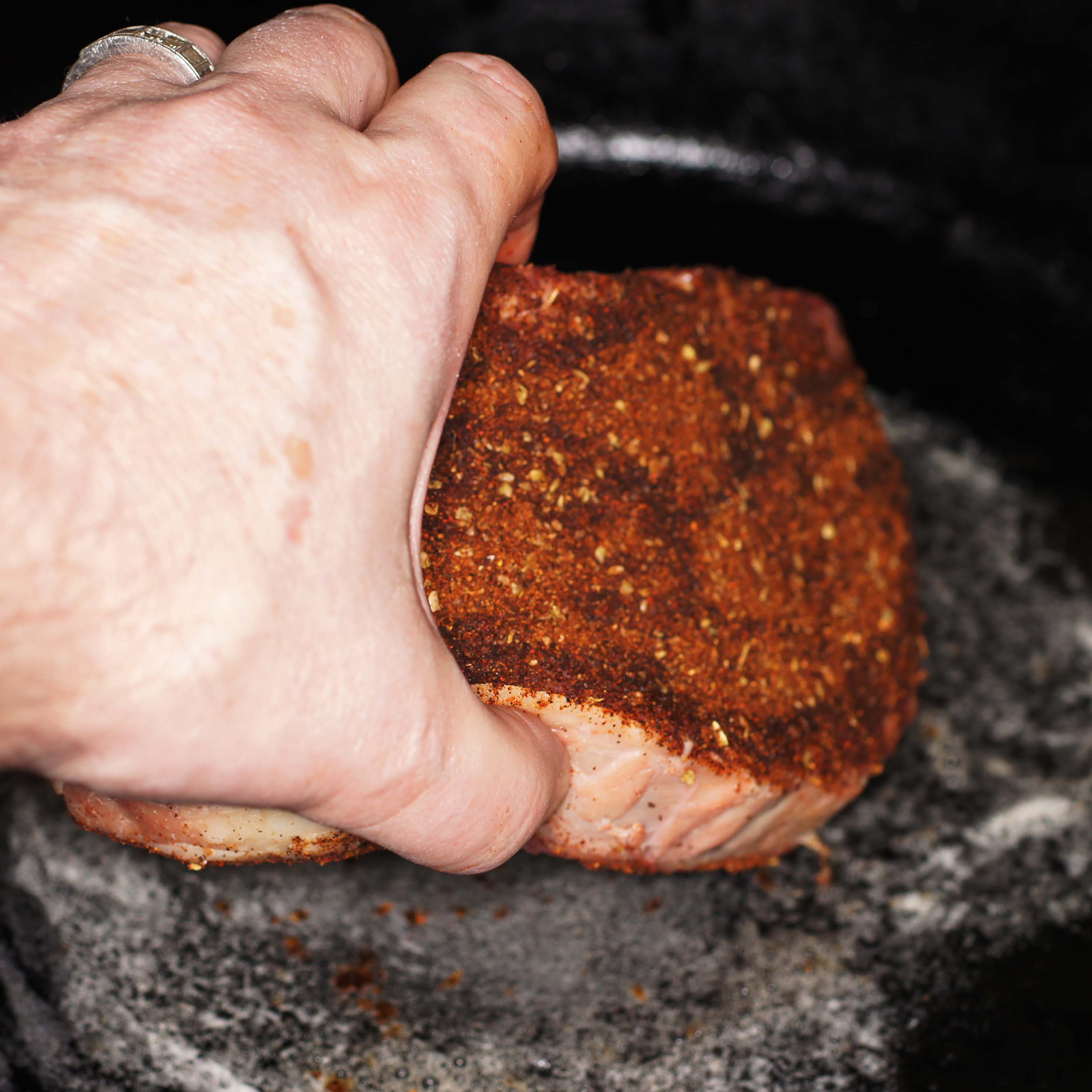 Place the steak in the cast iron skillet and cook until golden brown, roughly 3 minutes.