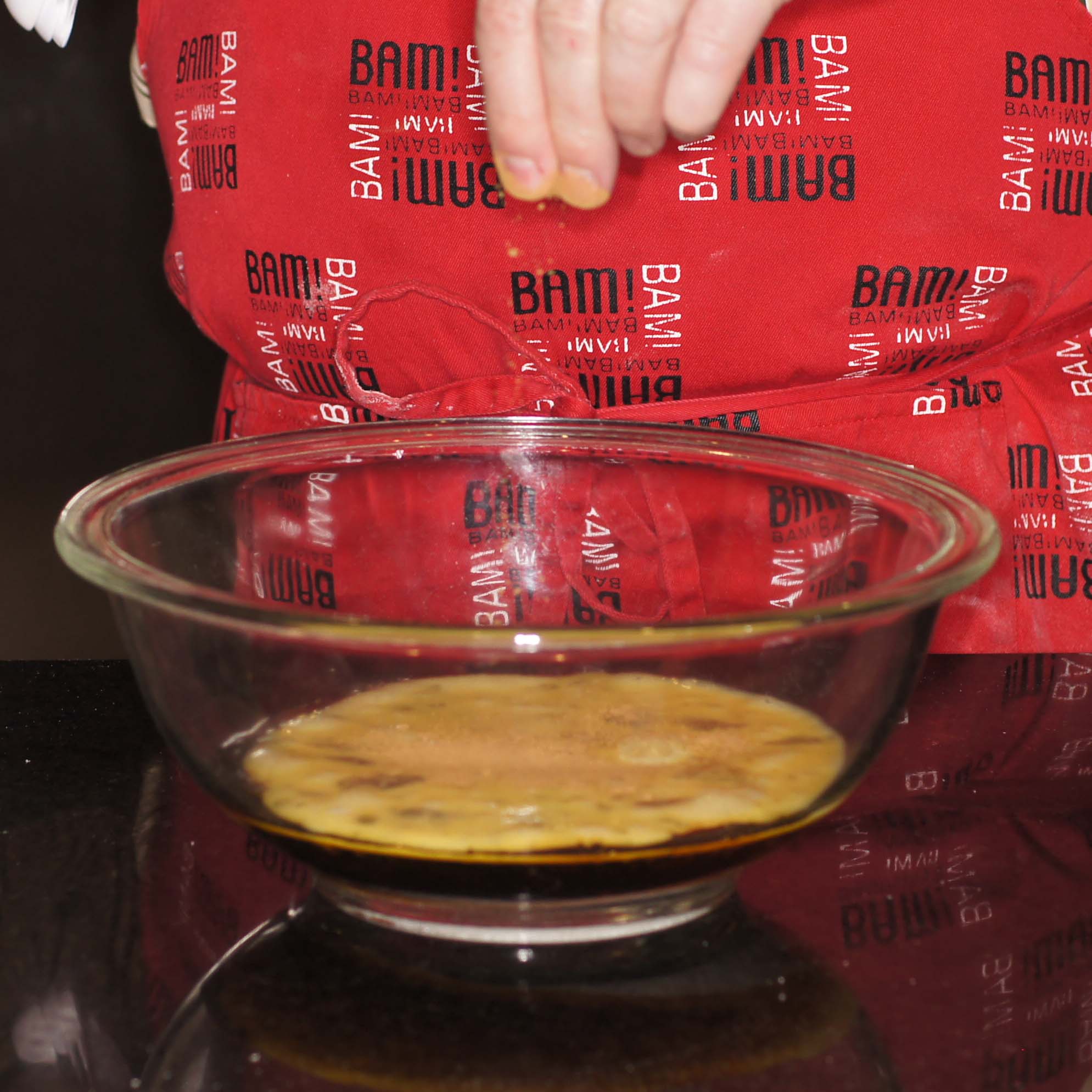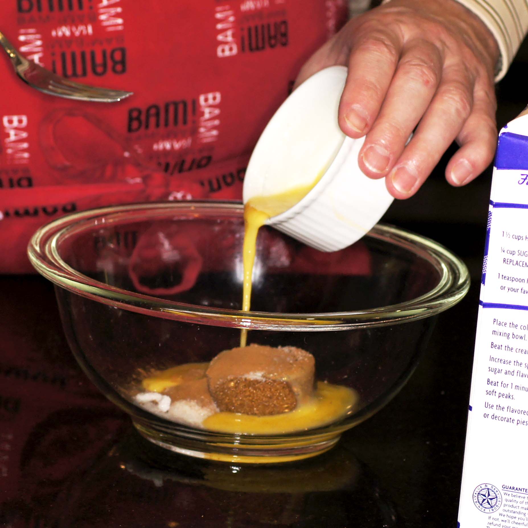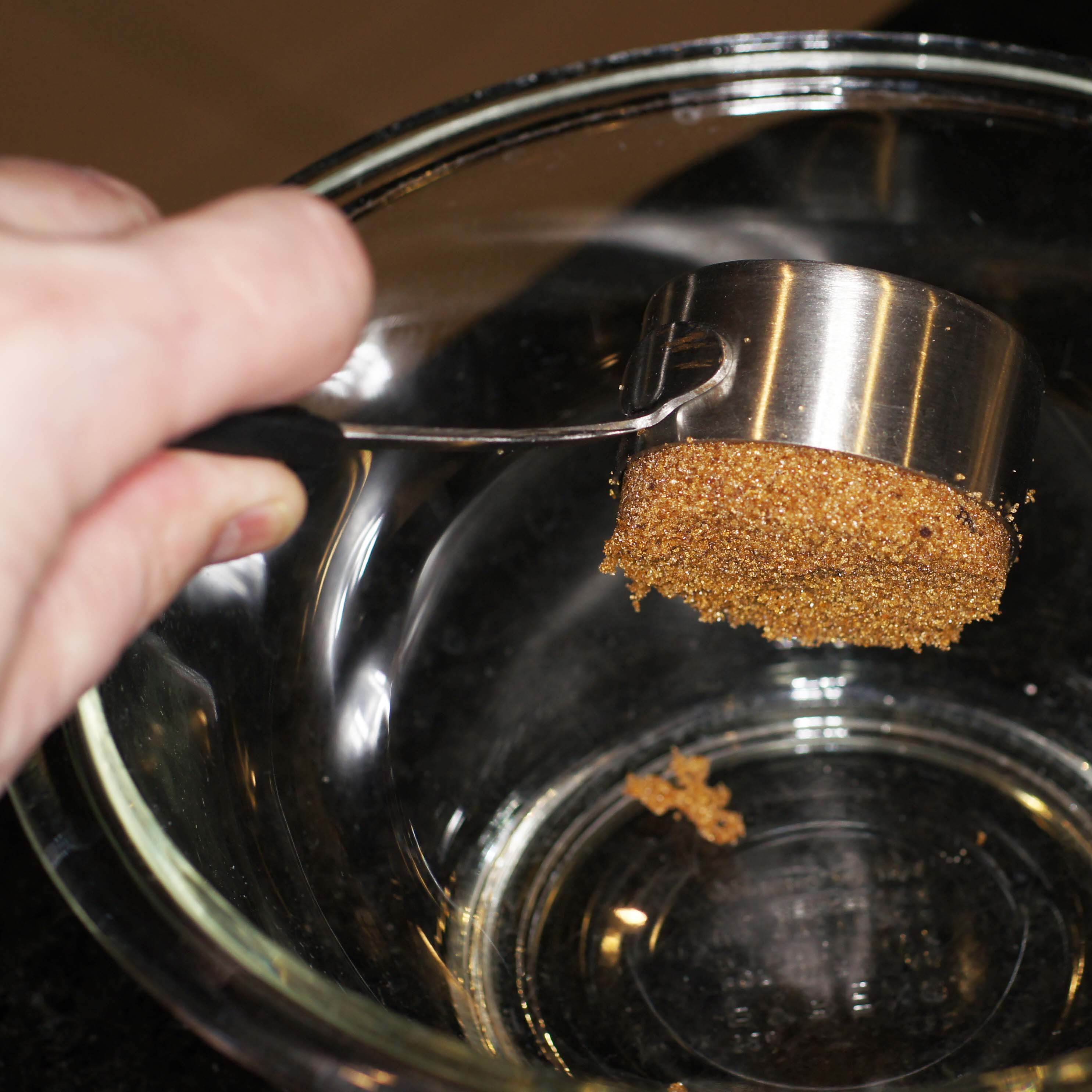 Once you have your pie dough finished, make the pumpkin custard. Start by adding the brown sugar to a mixing bowl,