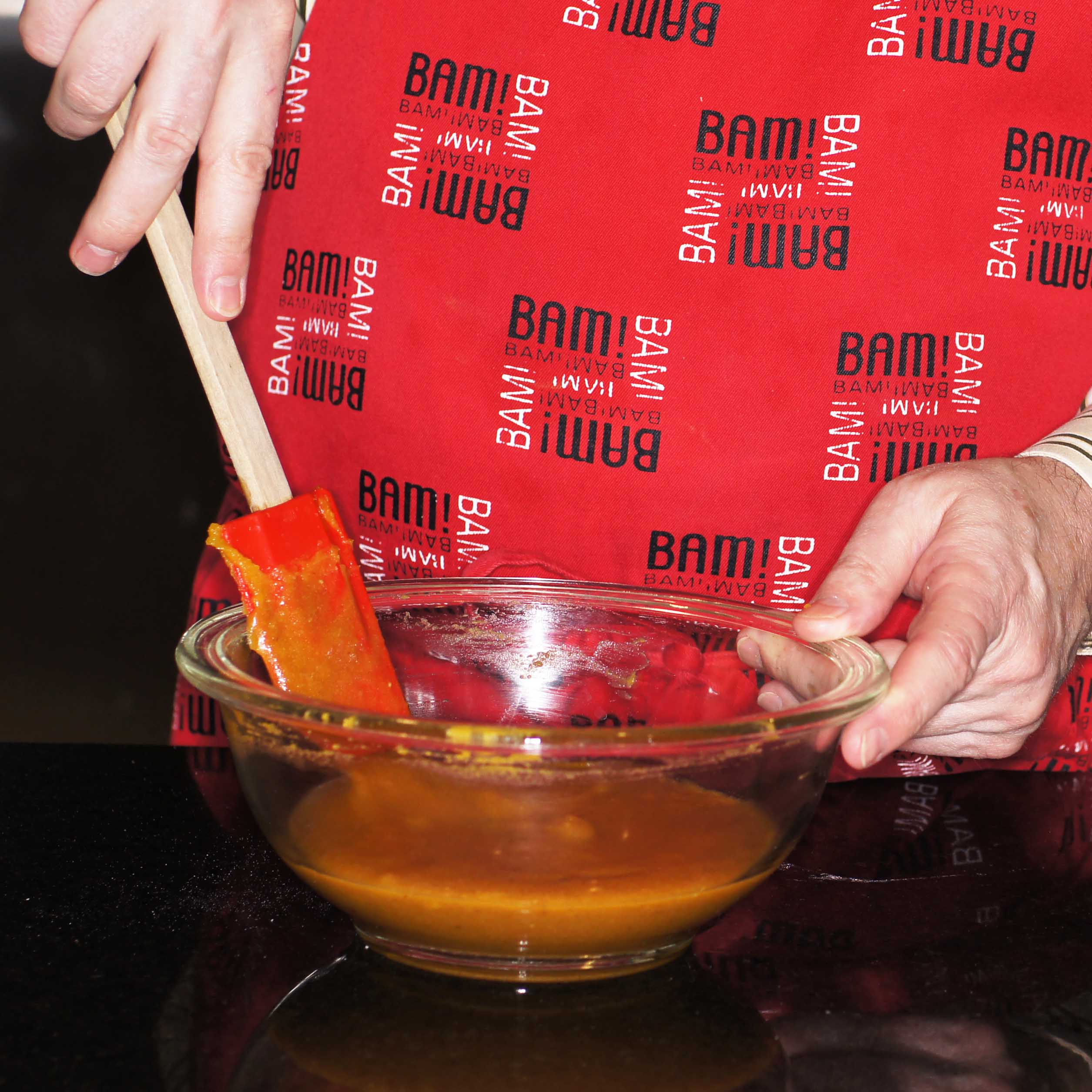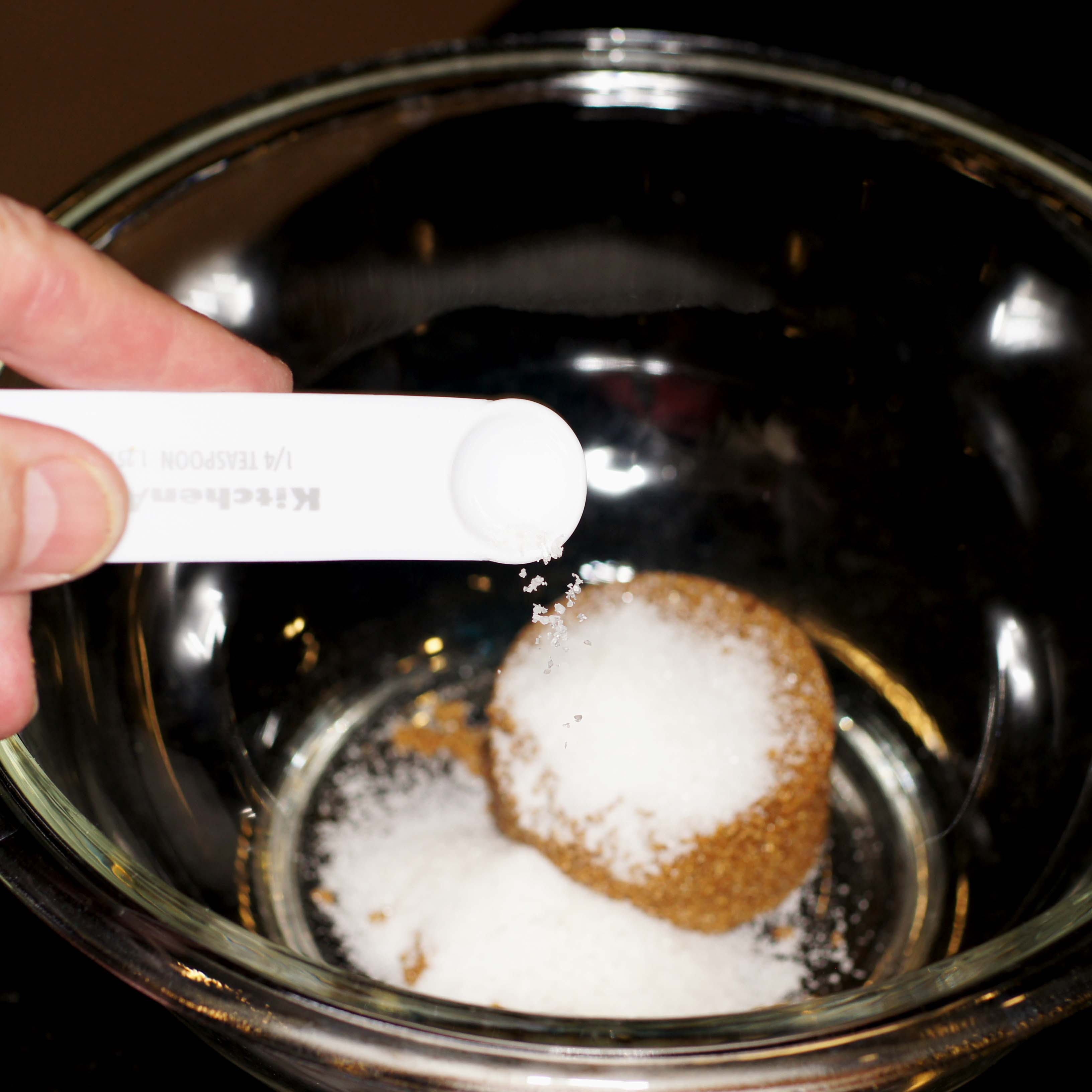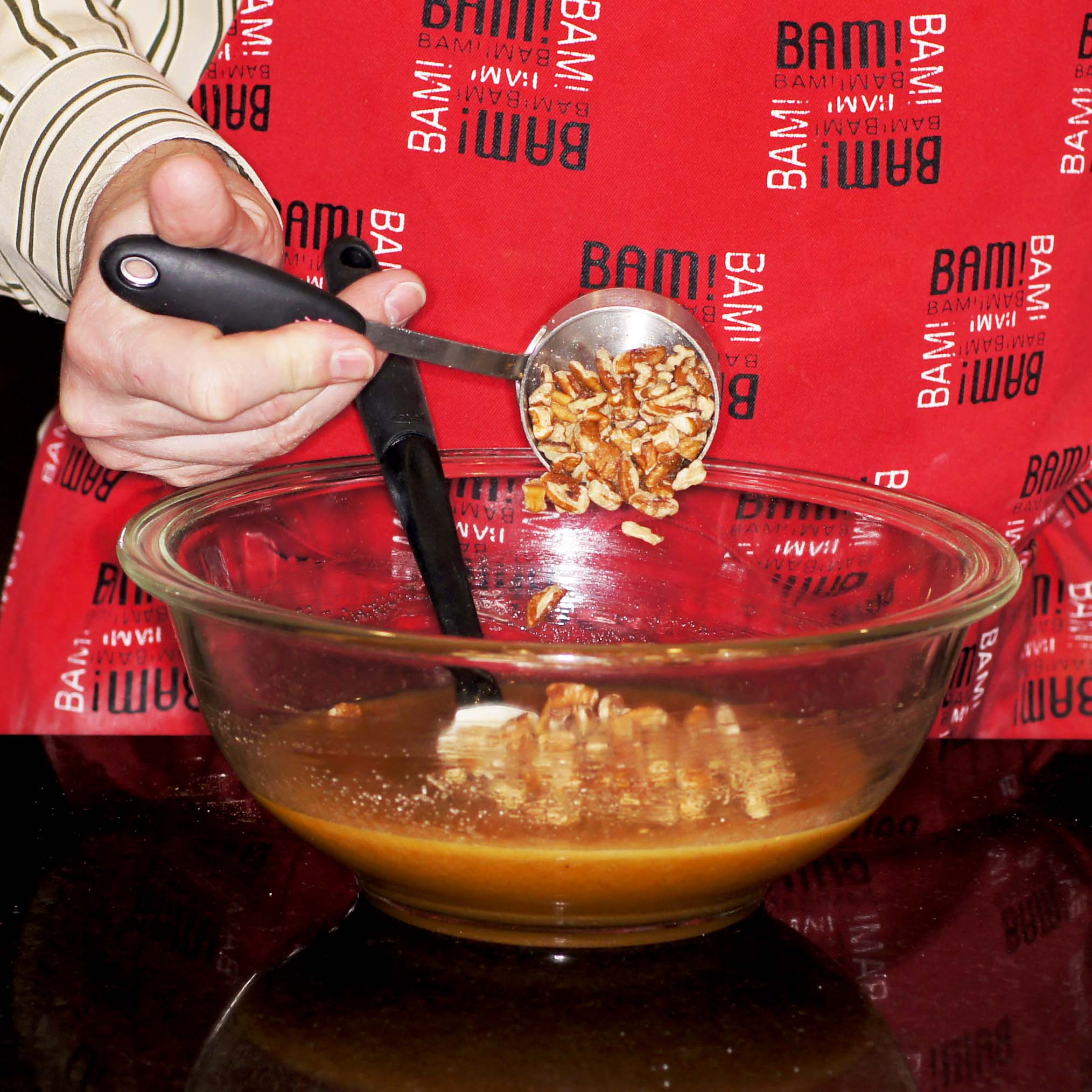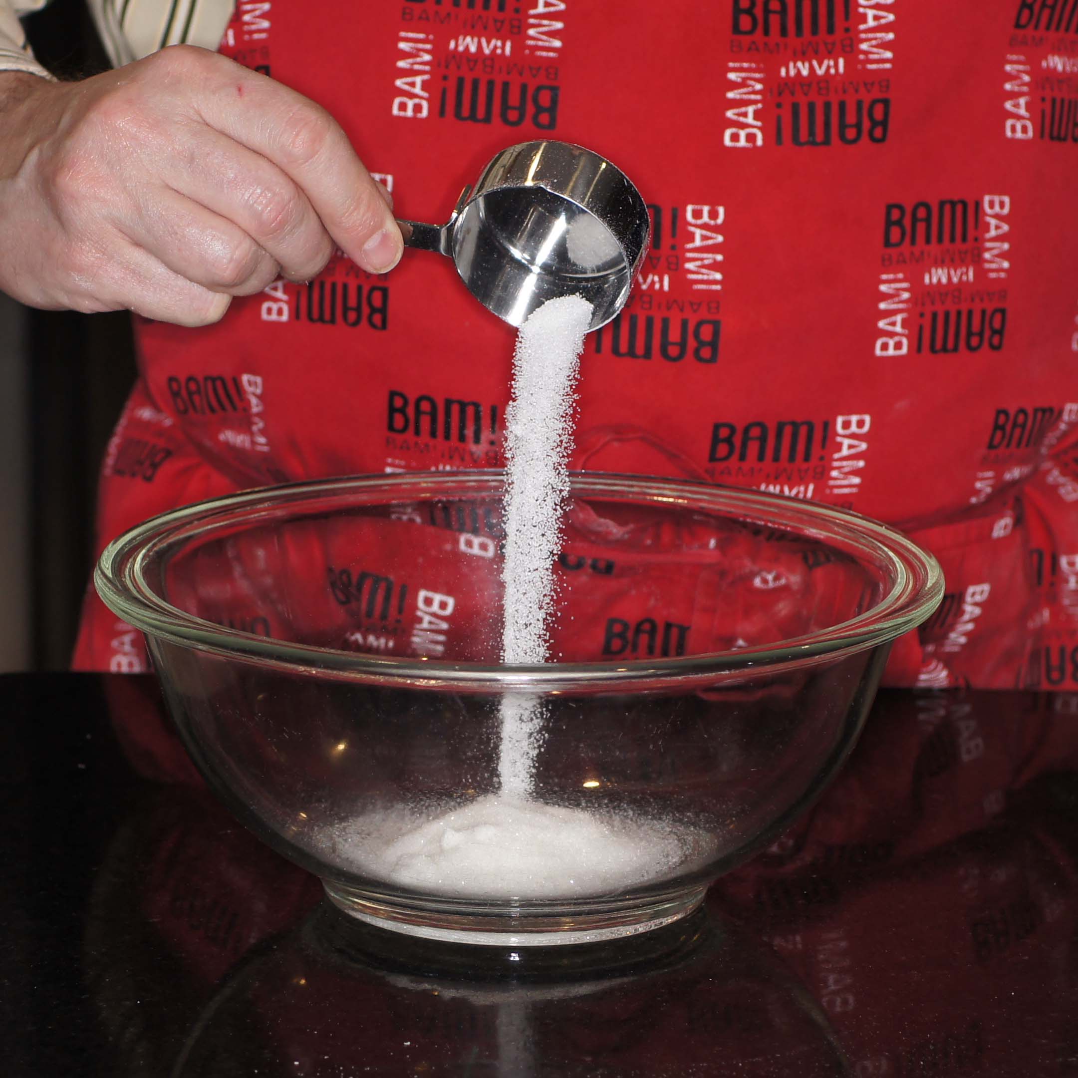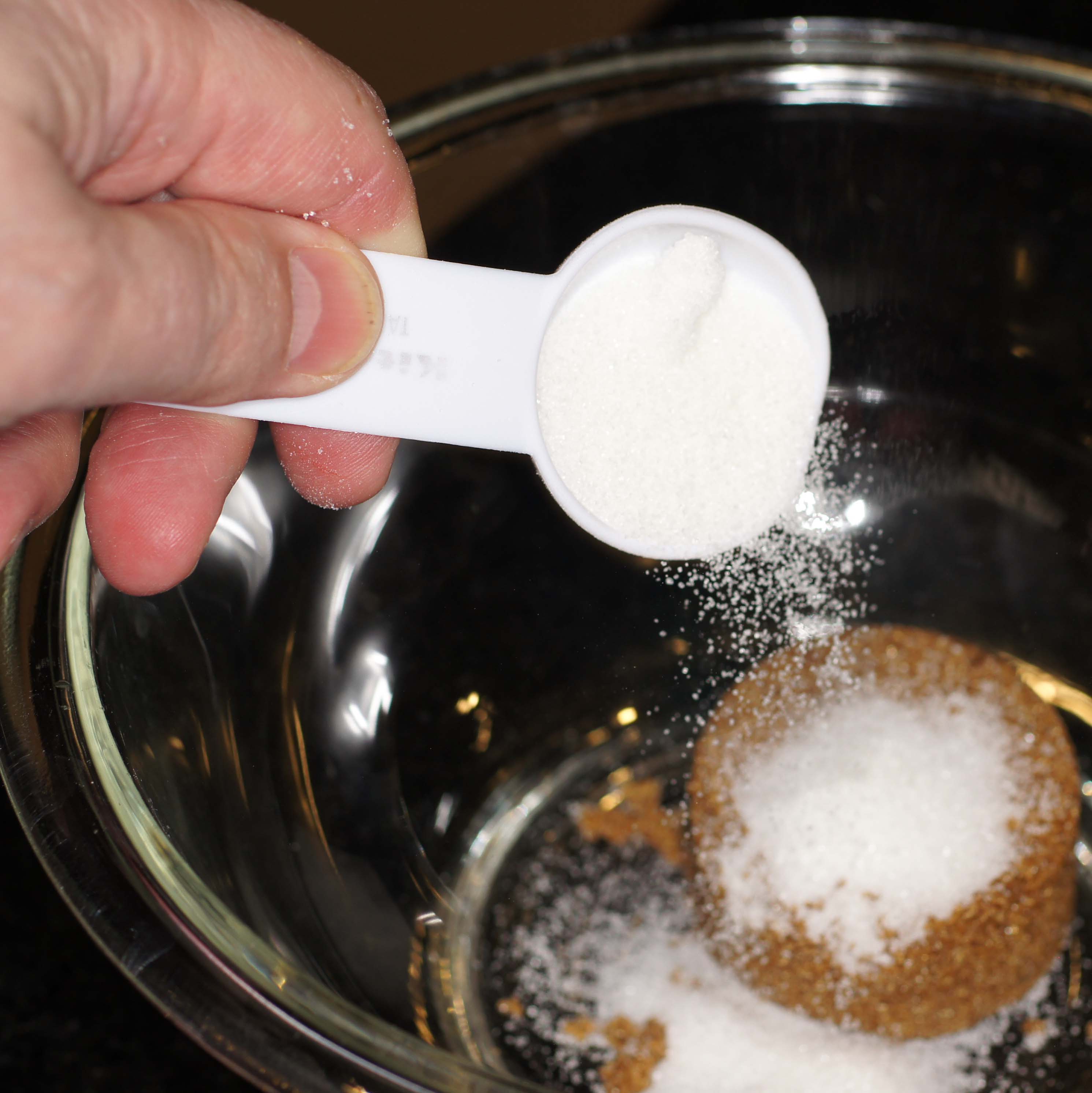 Now, make the pecan syrup to pour over the top. Start by adding the sugar to a mixing bowl.