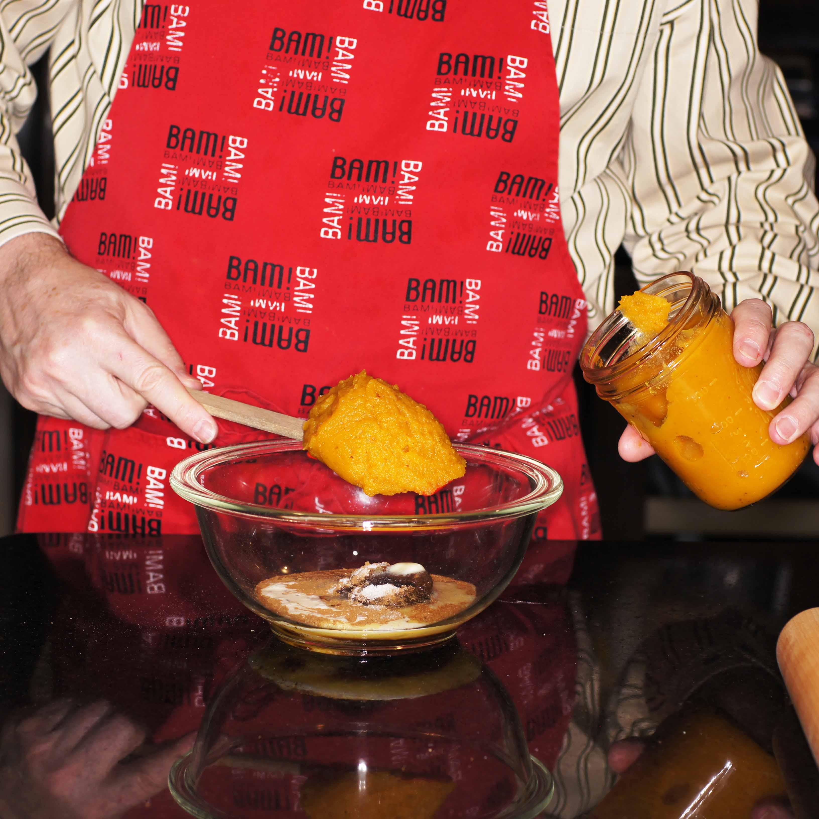 It’s been a while since we posted a dessert. So this post was due. It’s also late because you currently cannot find pumpkins.* Nevertheless, every Fall we purchase several nice sugar pumpkins to make pumpkin puree. One regular sugar pumpkin makes roughly 5 cups of puree. Once the puree is made you have accomplished the most difficult part of this recipe and, for the most part, any pumpkin recipe. 🙂 Pumpkin puree is inexpensive to make and stores very well so there is no excuse not to make pumpkin puree when pumpkins are abundant. The problem is that once you have made pumpkin puree what do you do with it? We’ve shown you our sour cream pumpkin pie and our pumpkin soup with a Caribbean flair. Baby Lady makes a killer pumpkin bread but I never get her to slow down enough for me to get photos to post her recipe. Pumpkin puree goes well with apples to form a beautifully luxuriant sauce you can use for rabbit, pork or chicken. It is also used in risotto. Today, however, it’s a dessert and this is what we did.