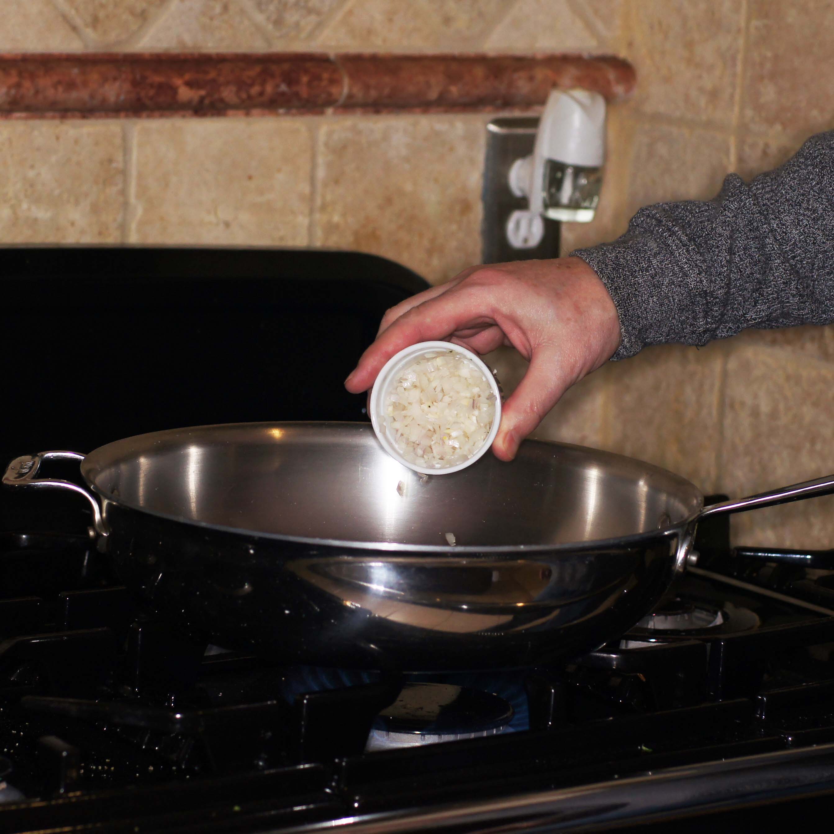 After 5 – 7 minutes, add the oil to a large skillet over medium high heat.