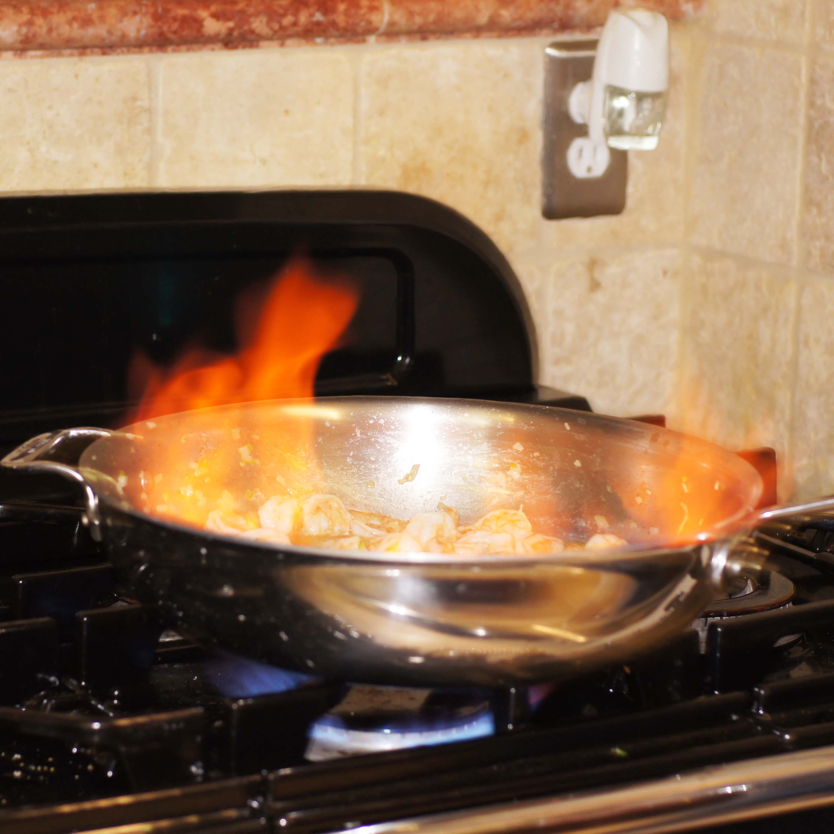 Cook 1 minute, add the tequila and flame. Be careful adding the tequila as it is 40% alcohol by volume and is volatile.