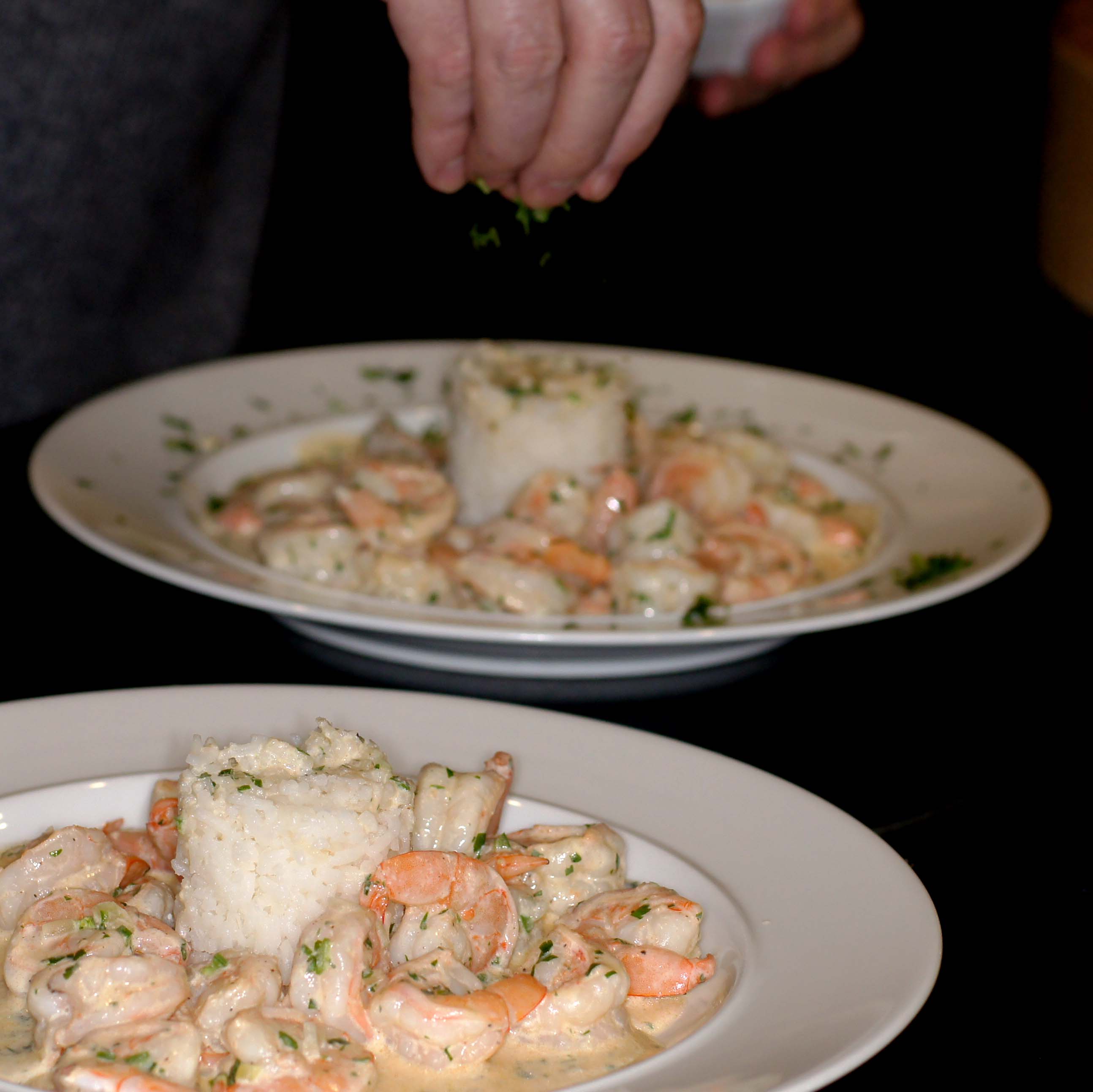 Place a ring of cooked white rice in the center of the plate and spoon the shrimp around the rice making sure to get some of the wonderful sauce in each spoonful.