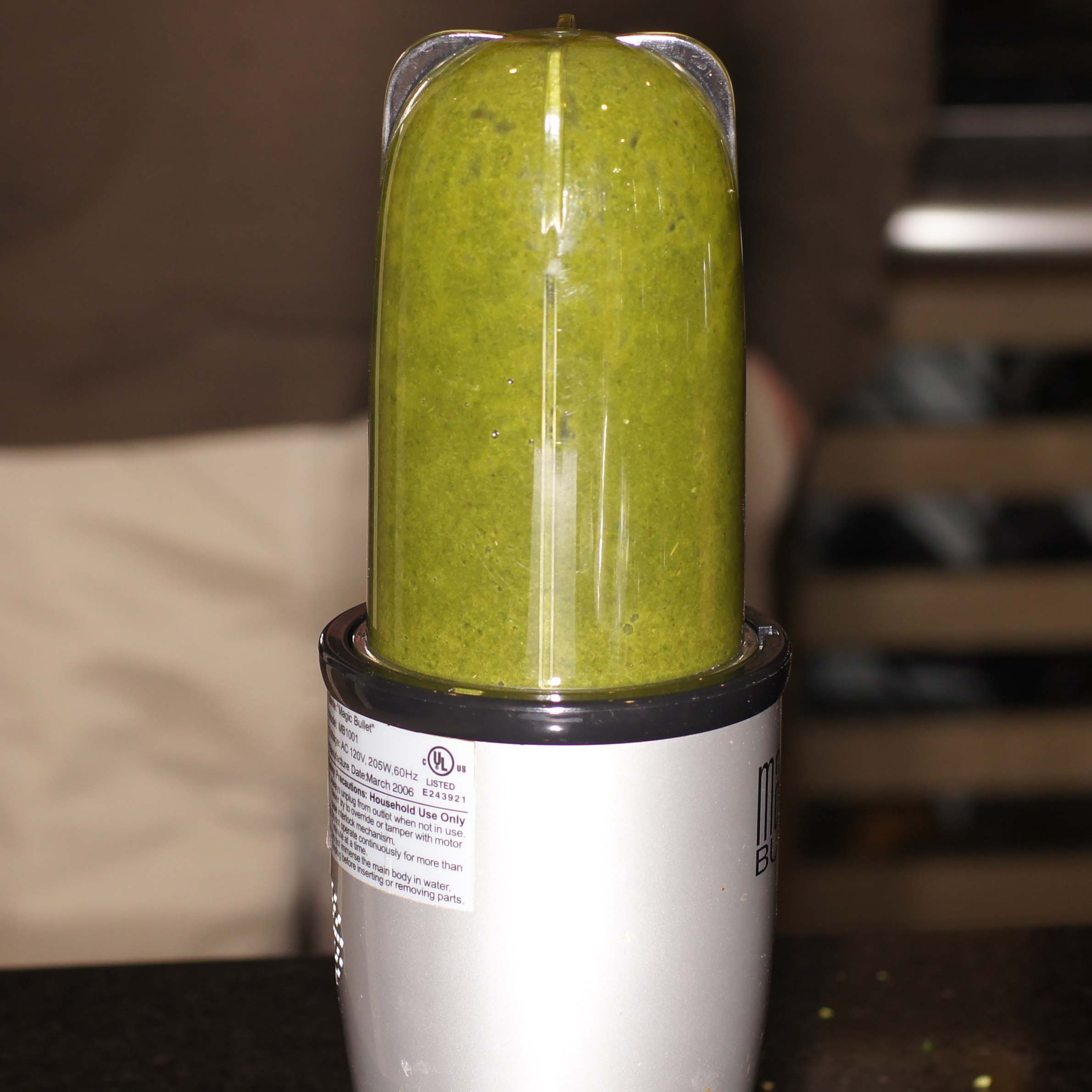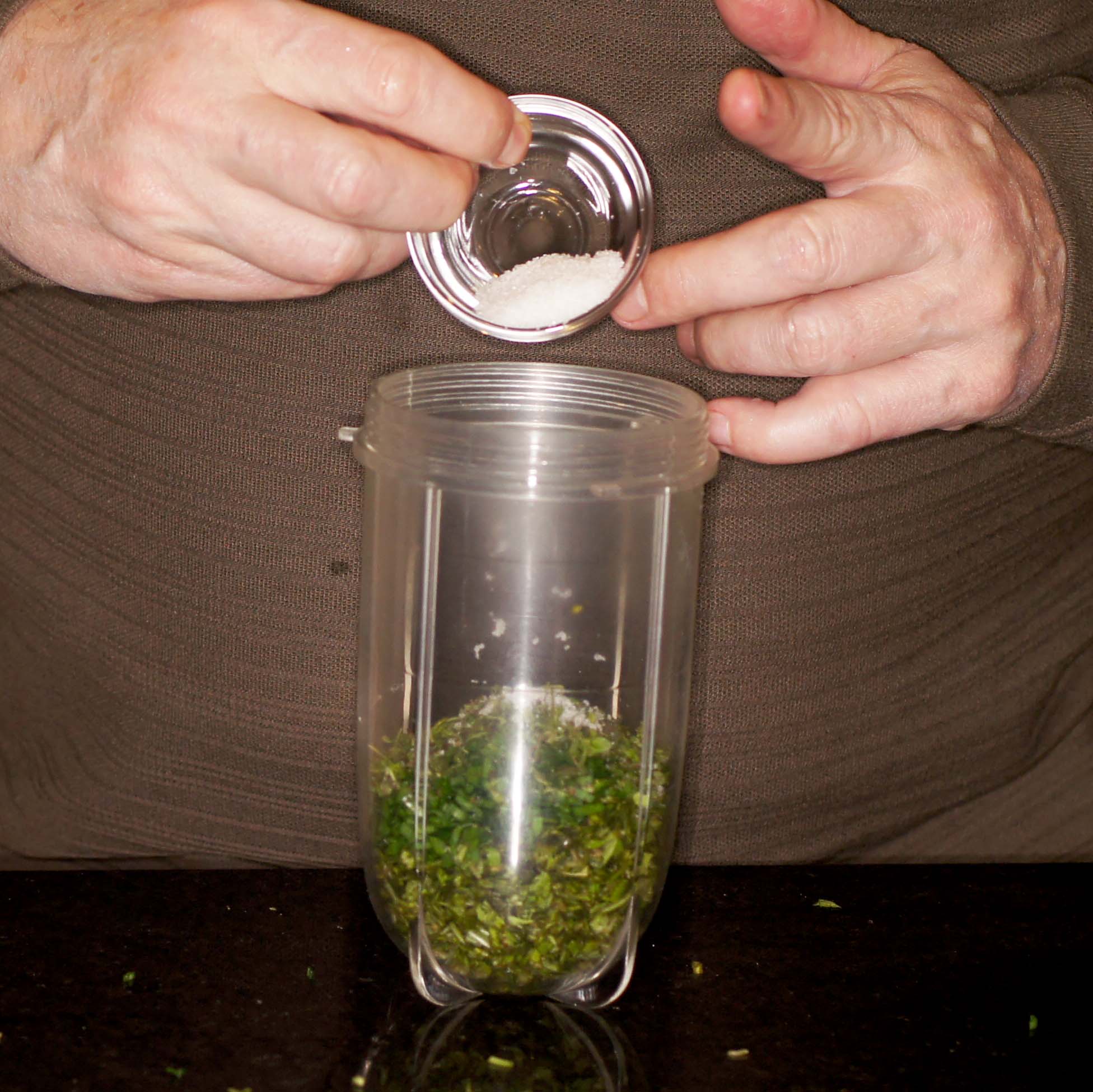 Heat the chicken stock in a microwave (or however you choose) until it boils. Add 1/4 cup of the boiling stock to the herbs in the blender.