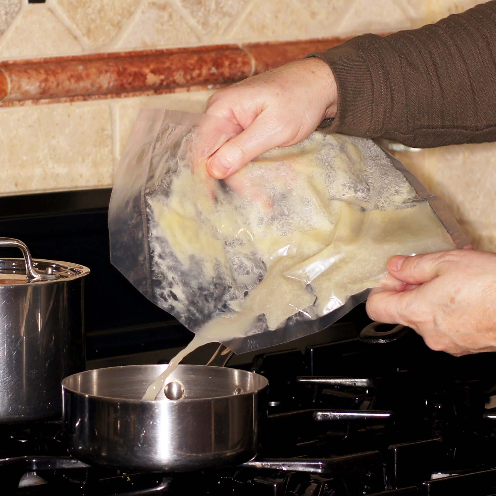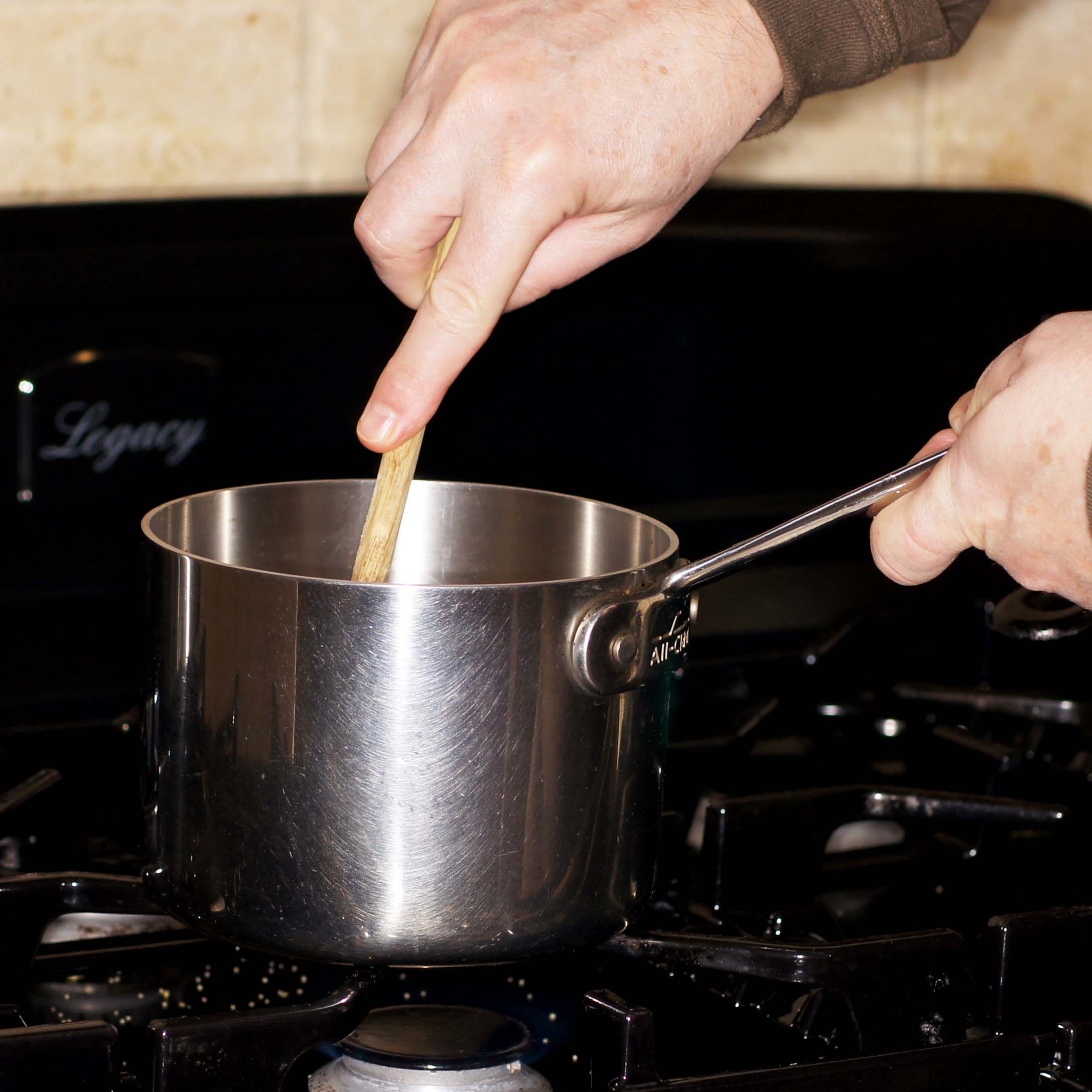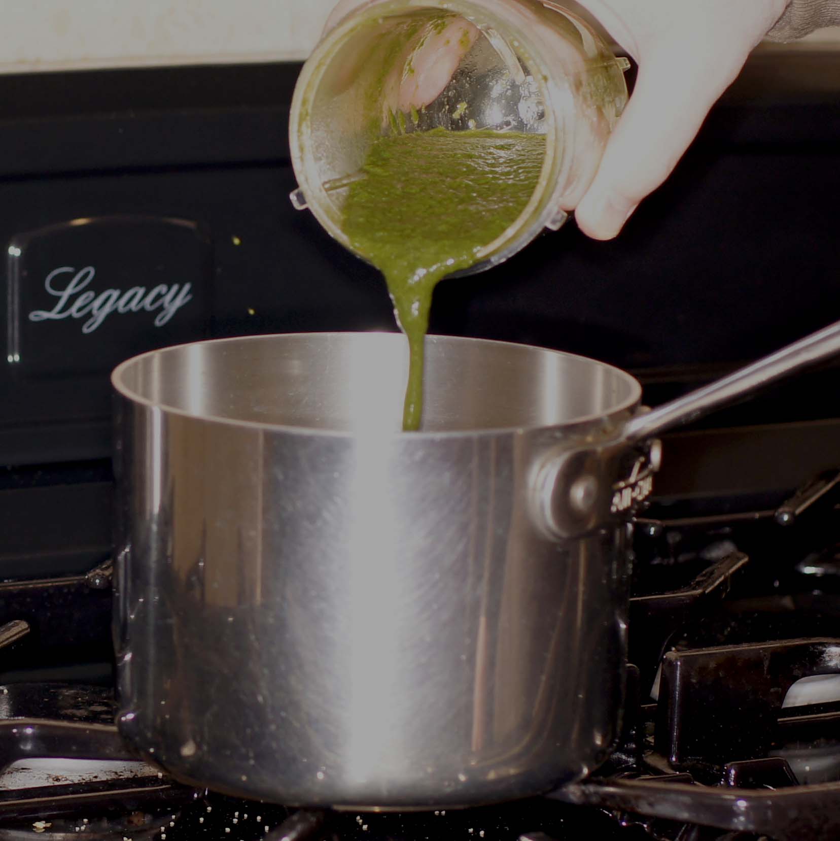 While the couscous is doing its thing, prepare the sauce. Start by adding the clam broth/soup to a small sauce pot over medium heat.