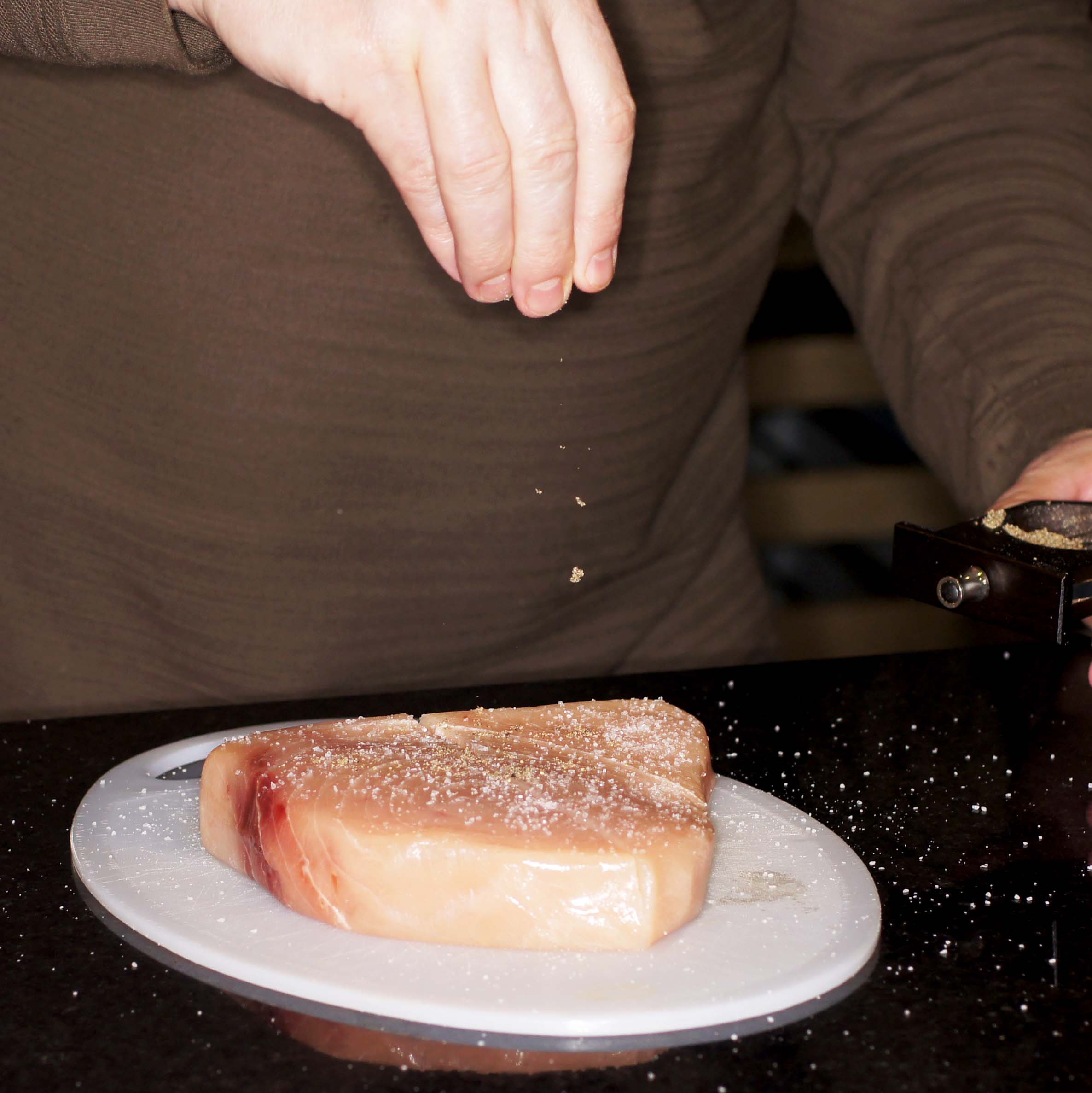 While everything else is cooking and almost done, season the swordfish filets with salt
