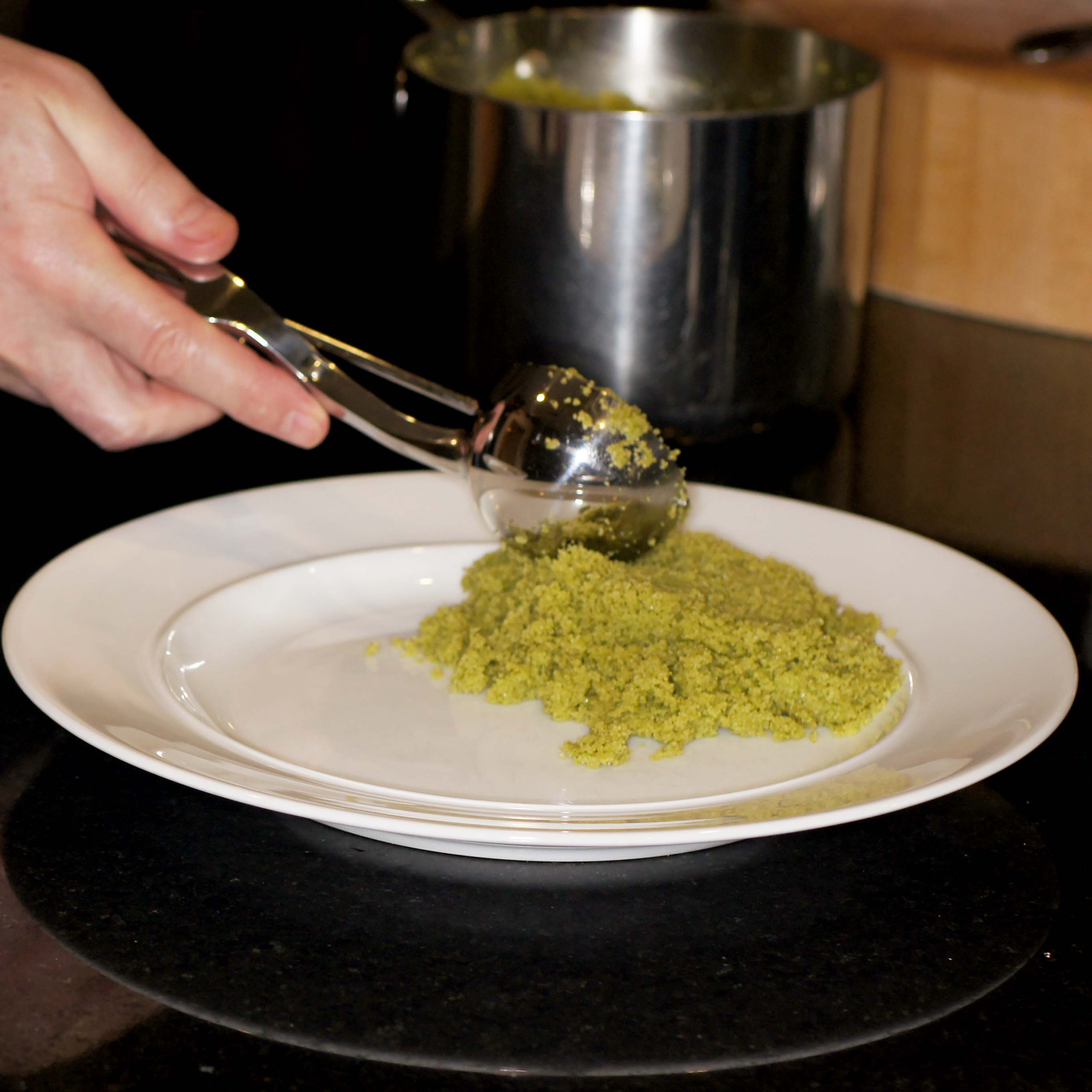 The couscous will take the longest time to cook and will hold while everything else is prepared; so, do it first. Add the basil to a small blender.