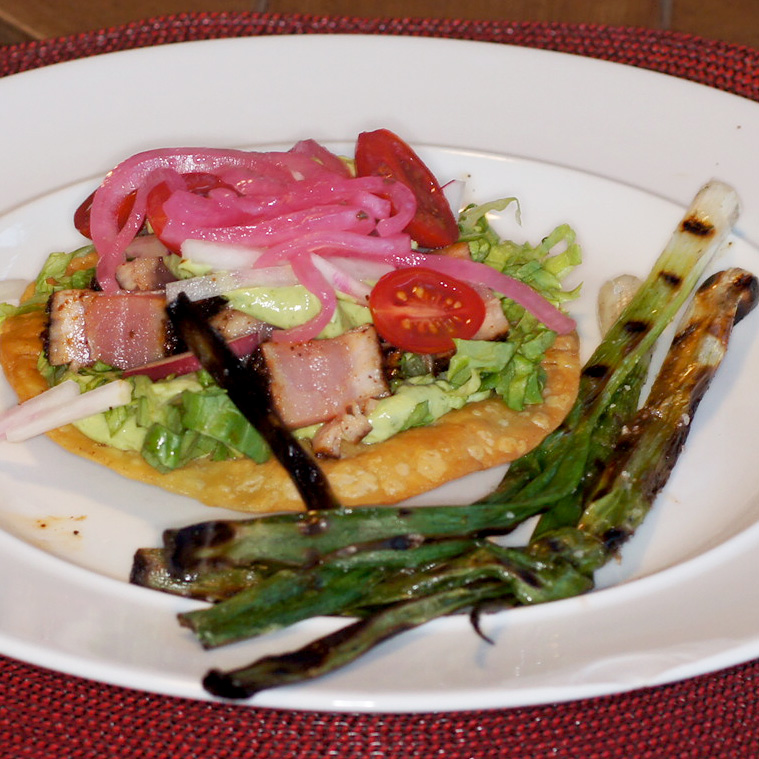 One of the things I really enjoy is grilling. There is something I just love about primal cooking over direct fire, even if it is the modern convenience of a gas grill. 😮 I love the outdoors, the fresh smell of nature and the joy of watching all the little critters that visit our little backyard. So, when we get the opportunity, we grill and dine on the porch under the arbor. Grilled tuna chalupas with crazy corn (Baby Lady’s name for Mexican Style Grilled Corn on the Cob (Elotes Asados)) and grilled green onions. Pretty nice spread, don’t you think?