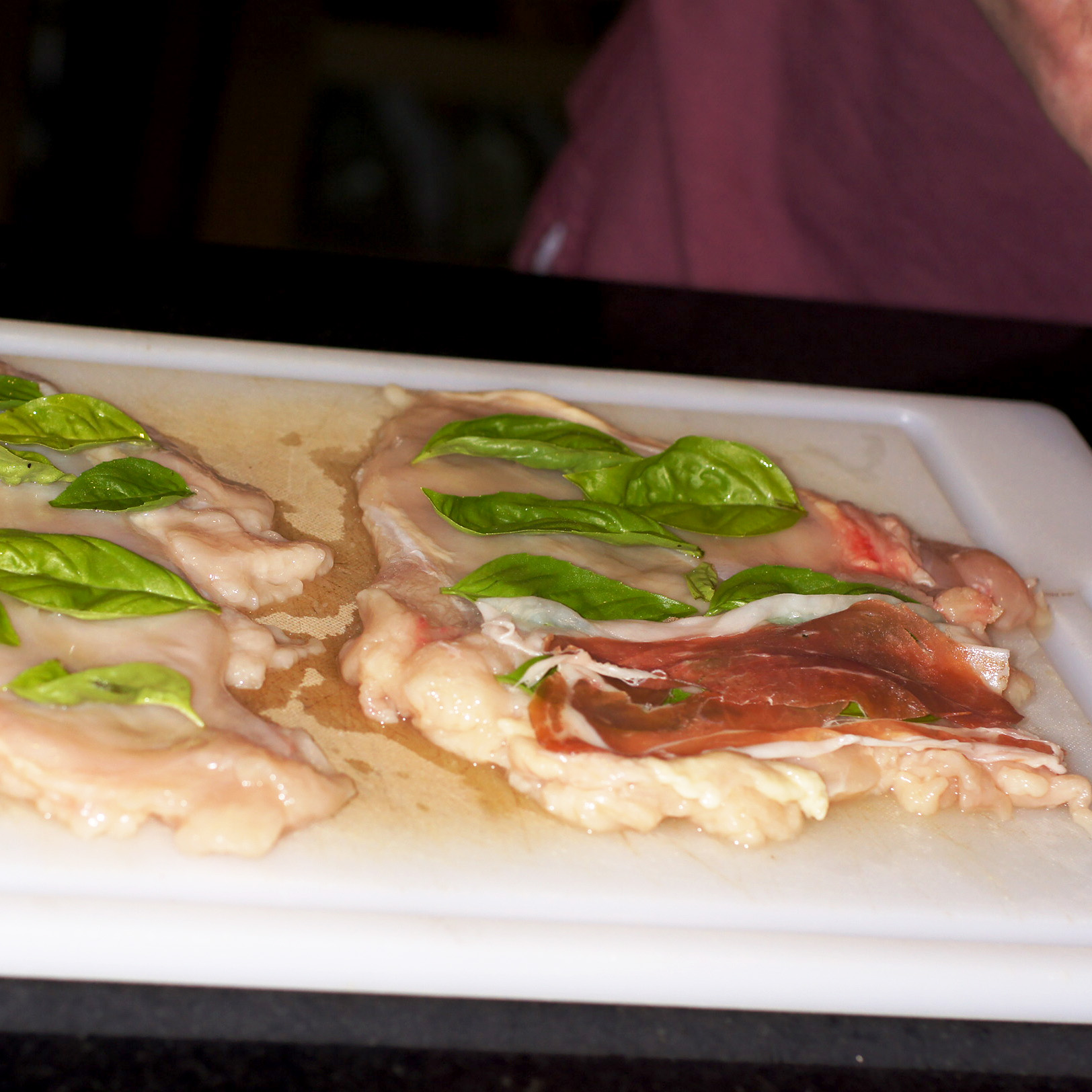 Sauté the chicken for 2 minutes or until the pieces are golden and gently turn, again being careful to ensure the prosciutto stays attached.