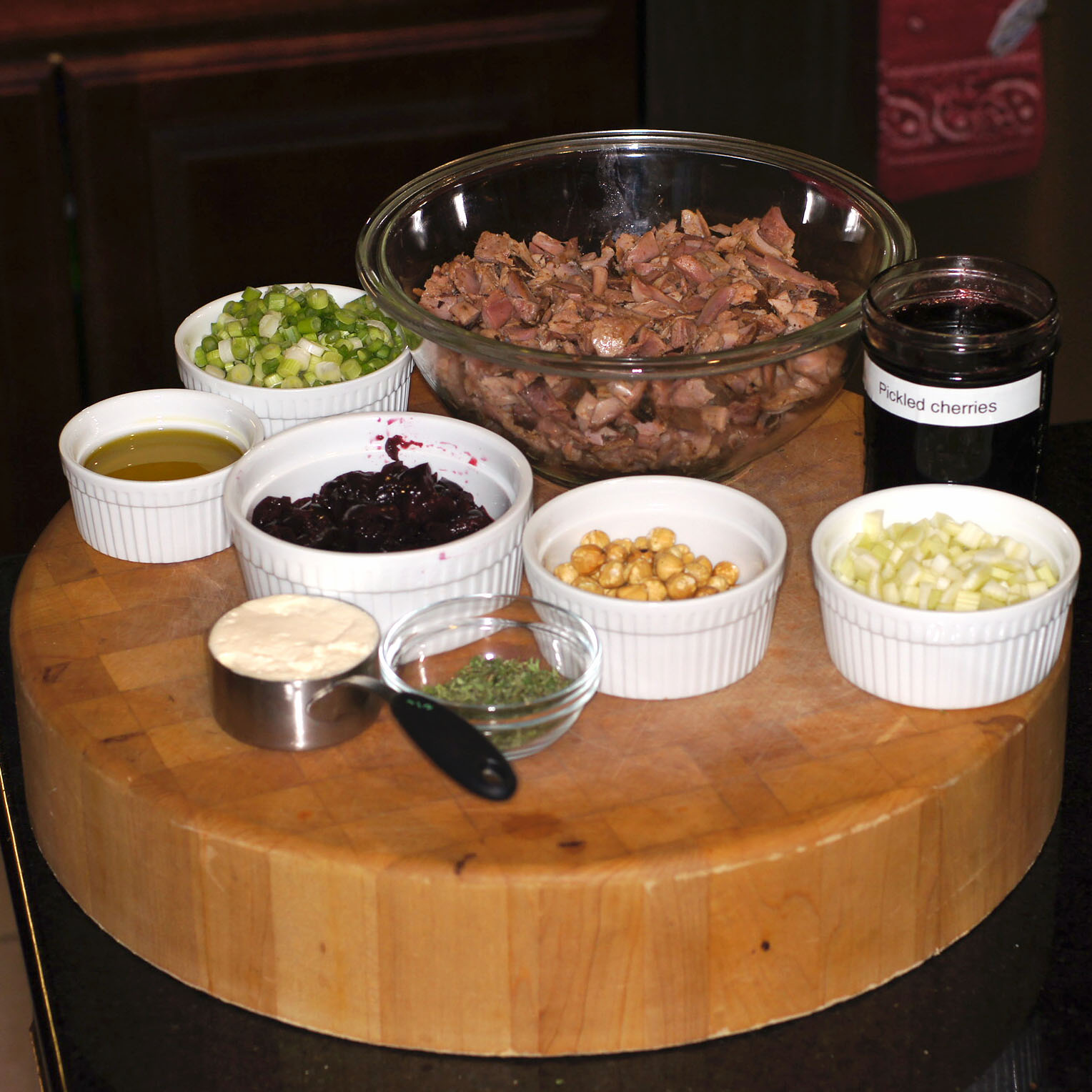 1. Very nice, Richard, this looks delicious. I really like the combination of the smoked turkey, toasted hazelnuts, pickled cherries, and goat cheese. I find it easier to pick the meat off the bones while they are still slightly warm.