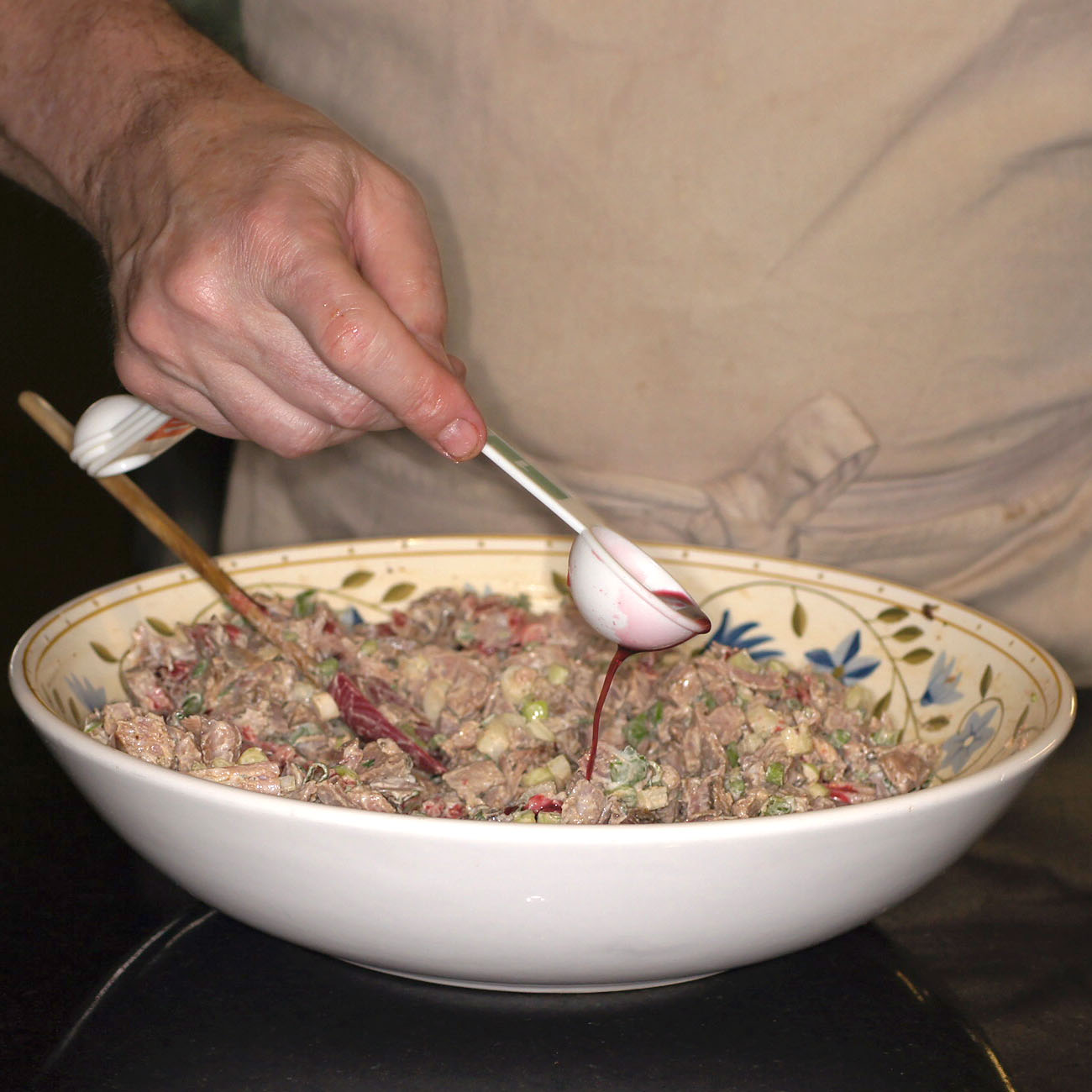 This is because you are going to add the tablespoon or so of cherry juice to the salad at this point. You want the salad to bind but you want to reinforce the flavors. This is going to be smokey, cherrylicious. 😉