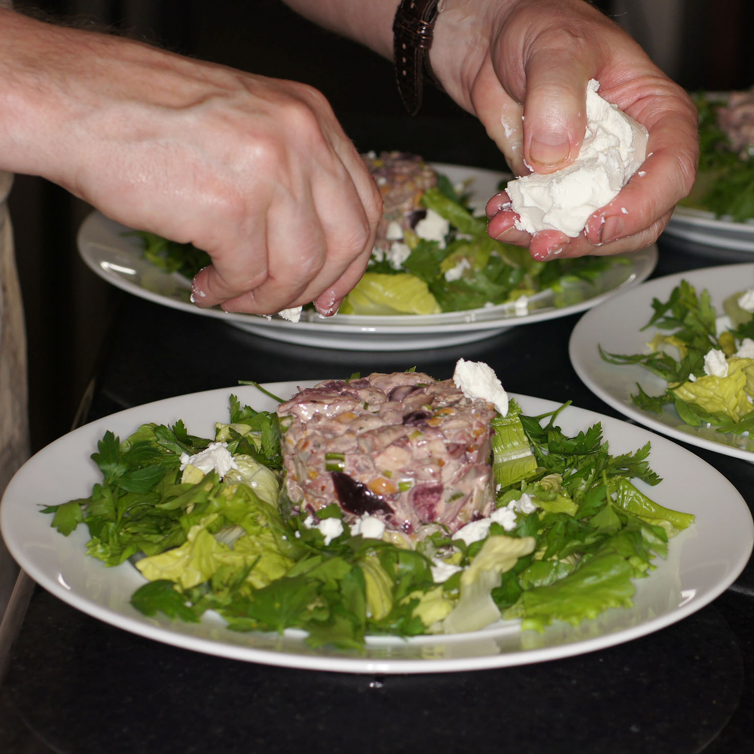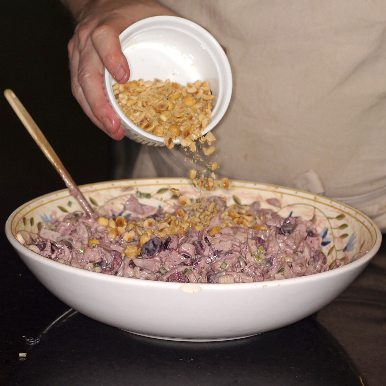 Smoked Turkey Salad with Pickled Bing Cherries, Roasted Hazelnuts and Goat Cheese
