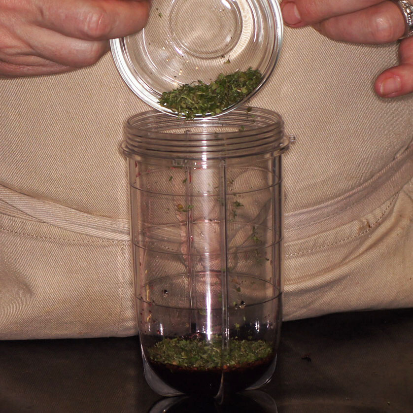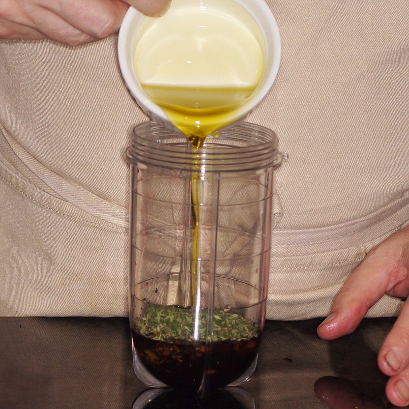 Now, make the vinaigrette. Add the cherry juice to a container.