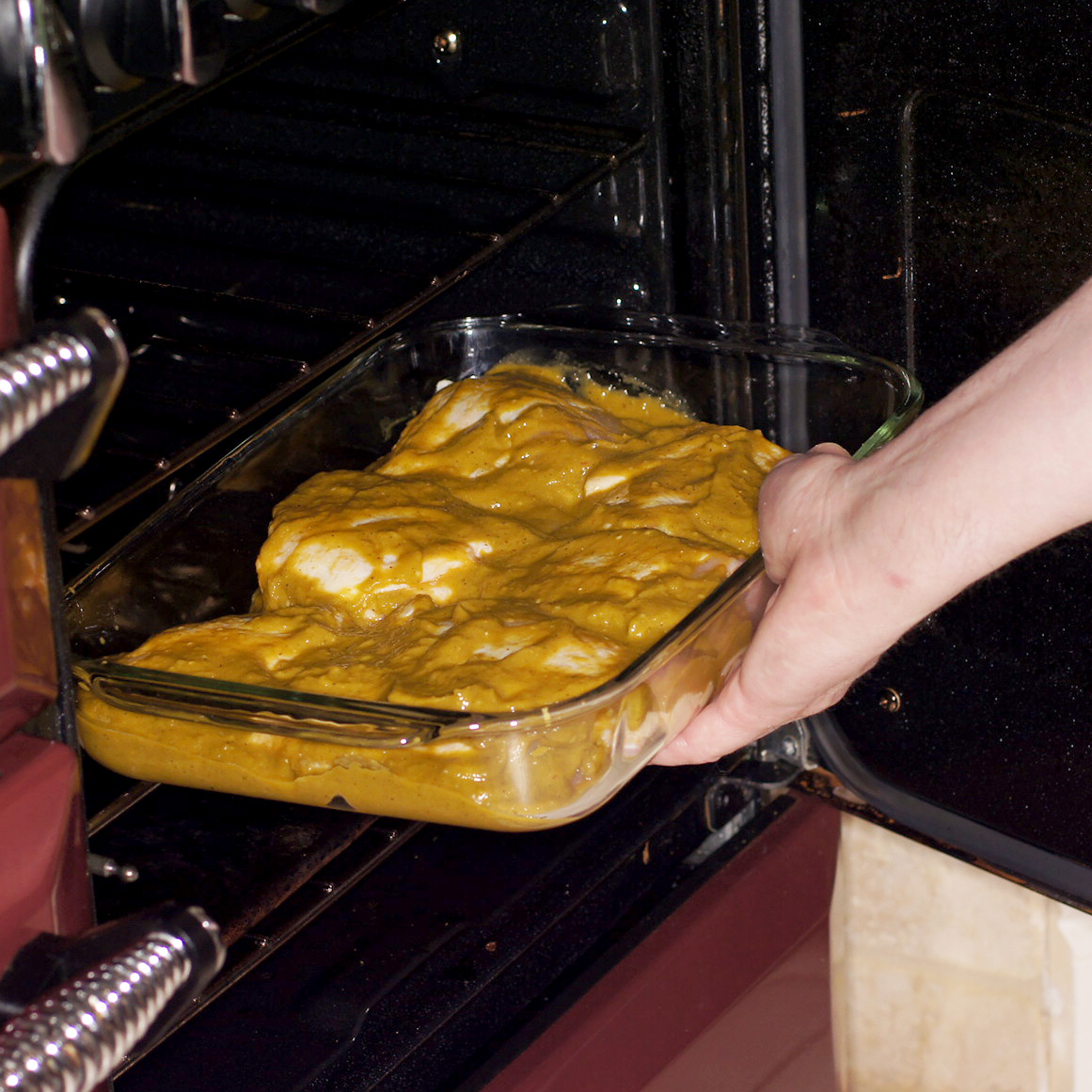 Place the chicken thighs in the oven at 350 F. Bake for 40 – 45 minutes or until done.