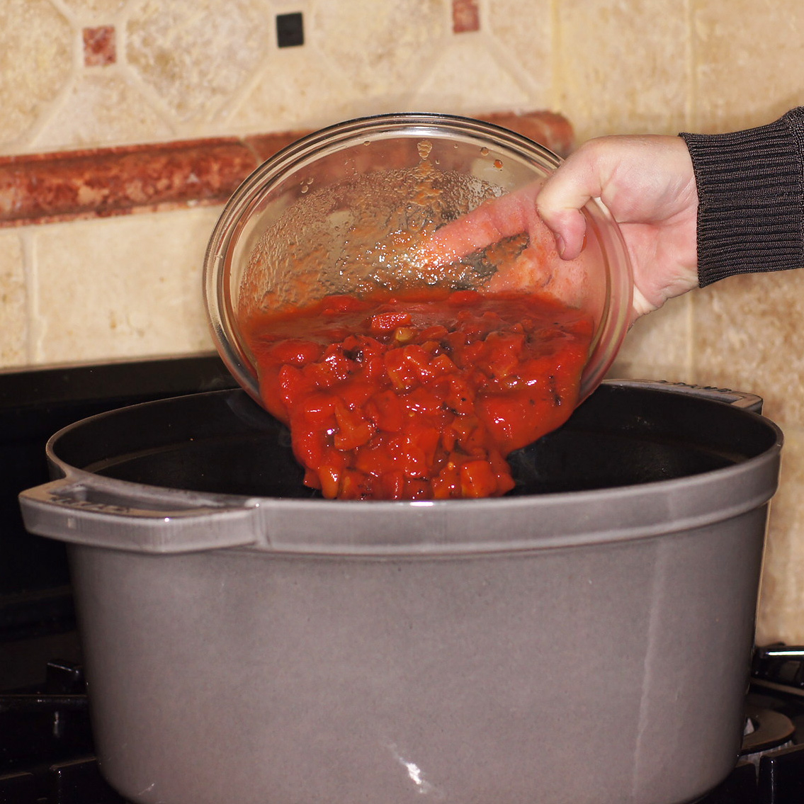 Cook slowly, stirring occasionally until onions are soft. Do not caramelize the onions. When soft, add the tomatoes
