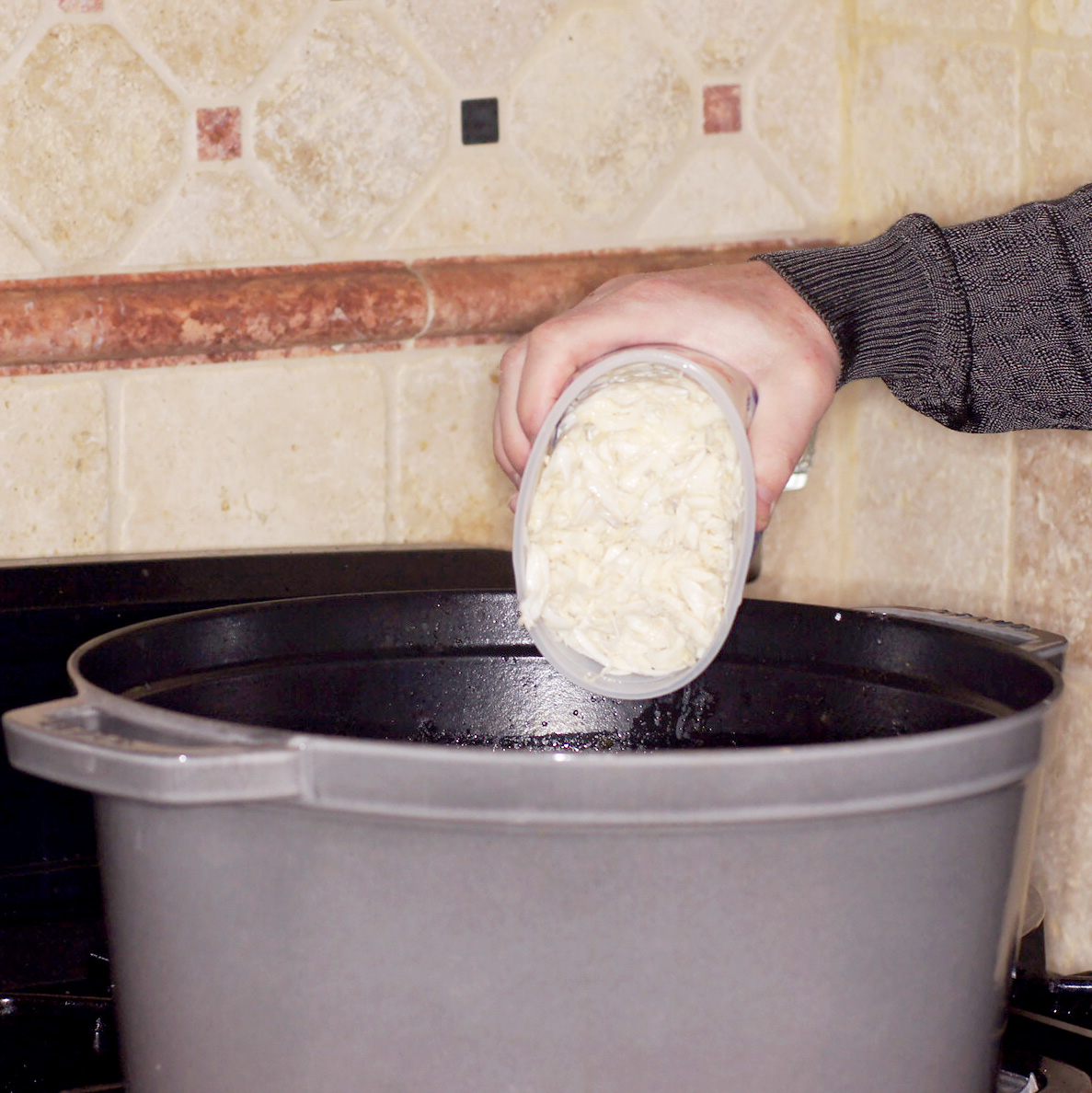 As for the pot, it’s a Staub 13-1/2 qt cocotte. When we first got it I put a 5 lb pork shoulder in it to braise it for some Mexican food meals. The 5 lb pork should looked very small in the pot. 😮 Even with 8 qts of cioppino, it looked pretty empty. I generally use it when I am making a large batch of stock with 5 or 6 chicken carcasses. Then, it’s full to the brim. 🙂