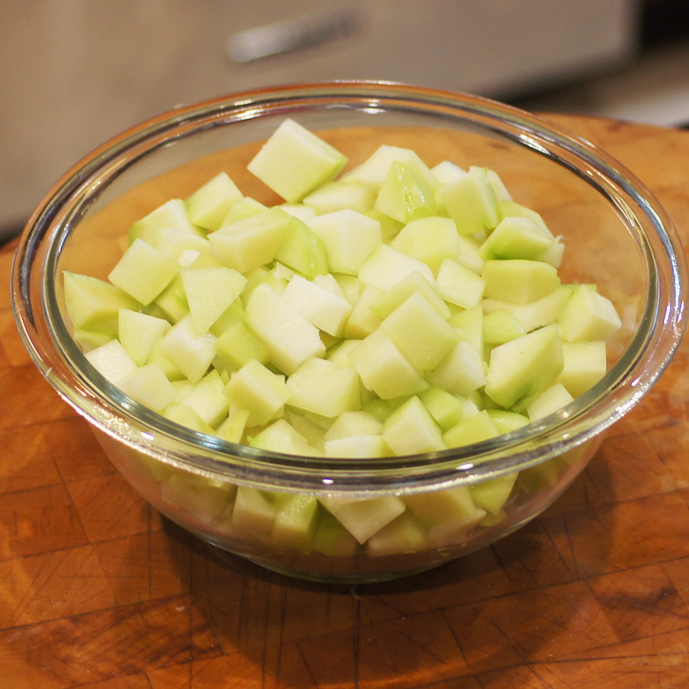 Peel the chayote, cut in half lengthwise and remove the pit. Cut the chayote into 1/2 inch cubes and put in a glass bowl.
