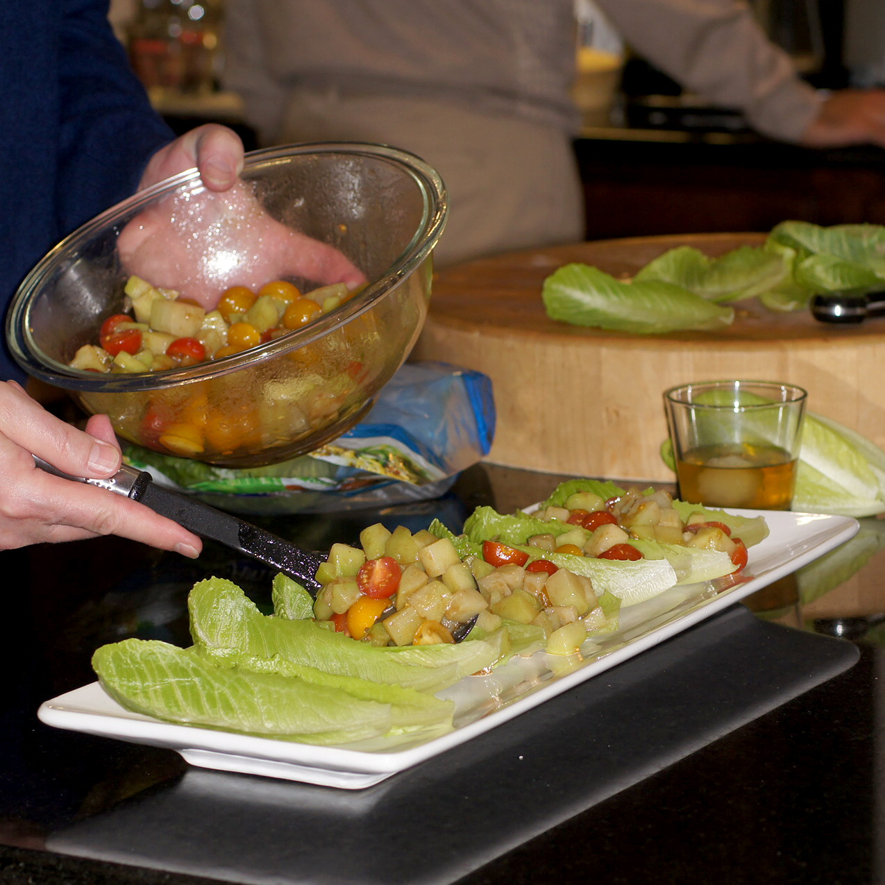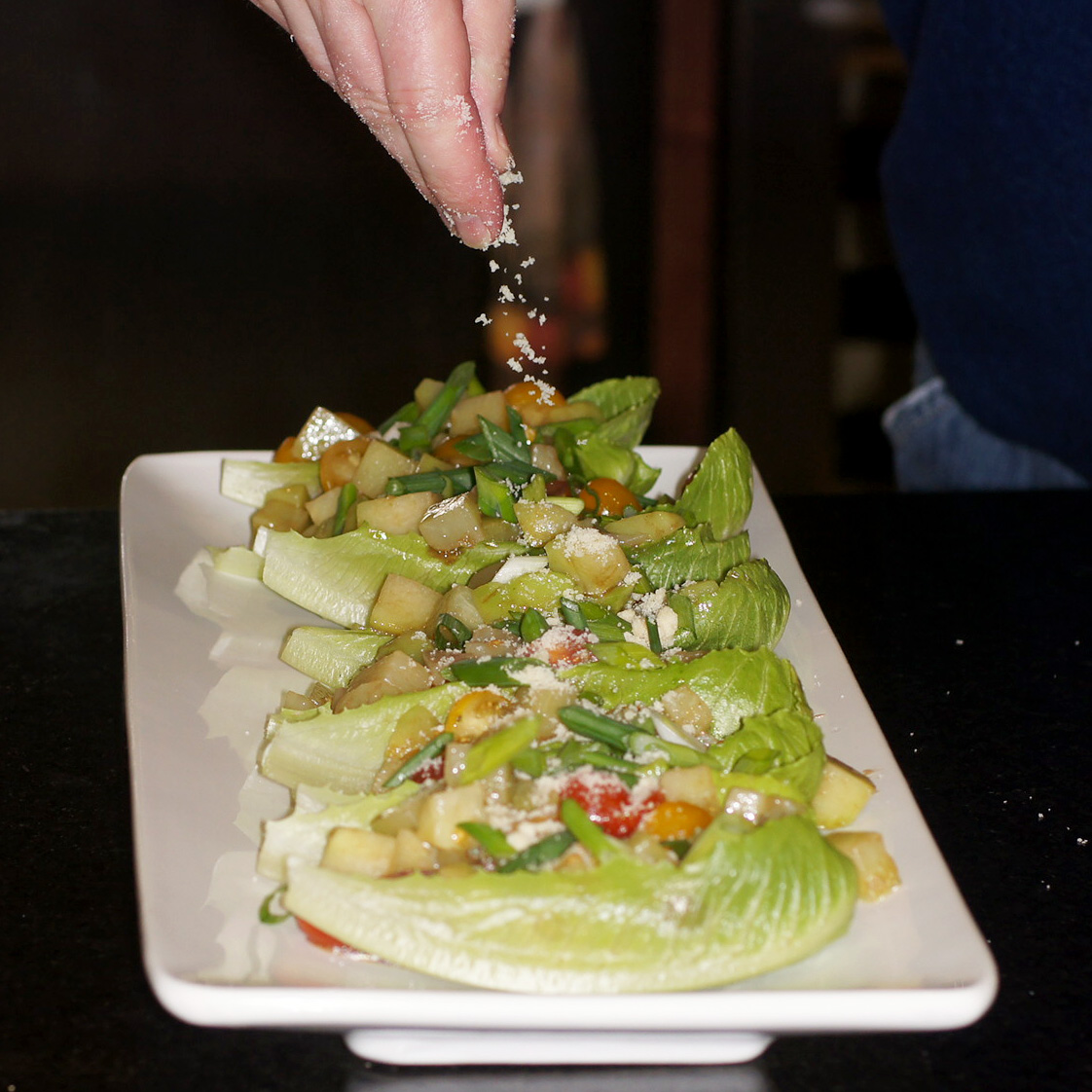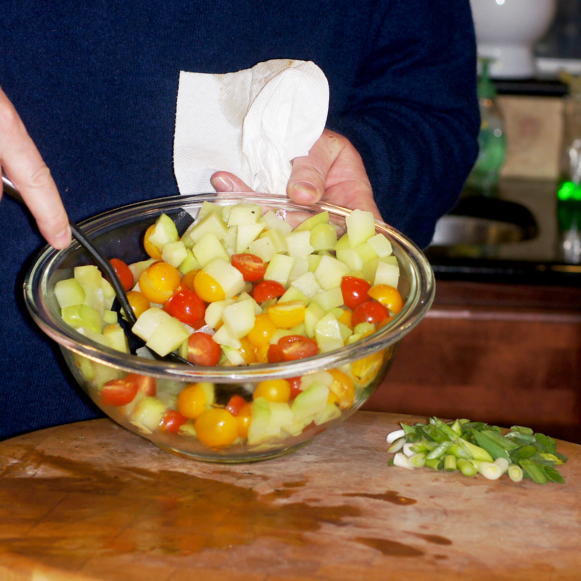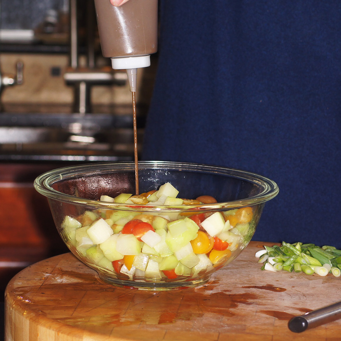 The fruit has a creamy white hued flesh with a semi-crisp texture and its central core contains a small pit. Like the cucumber (a distinct cousin), chayote has very little flavor thus allowing it to be a carrier sponge of a dish’s other accompanying ingredients’ flavors. It is this character as well as its texture that defines its uses in culinary applications. In this salad, you have a cucumber/mild melon like flavor with a semi-crisp texture that acts as the perfect foil for the roasted serrano, garlic, balsamic vinaigrette. It plays well with the cherry tomatoes, lettuce and green onions. You will absolutely love this salad and the dressing is wonderful with a variety of other uses, i.e. veggies and sandwiches. It’s so good we made it a separate post so you need to reference to it. 😮 The whole salad is simply killer. So you must make this dish. You will be glad you did and here’s how.