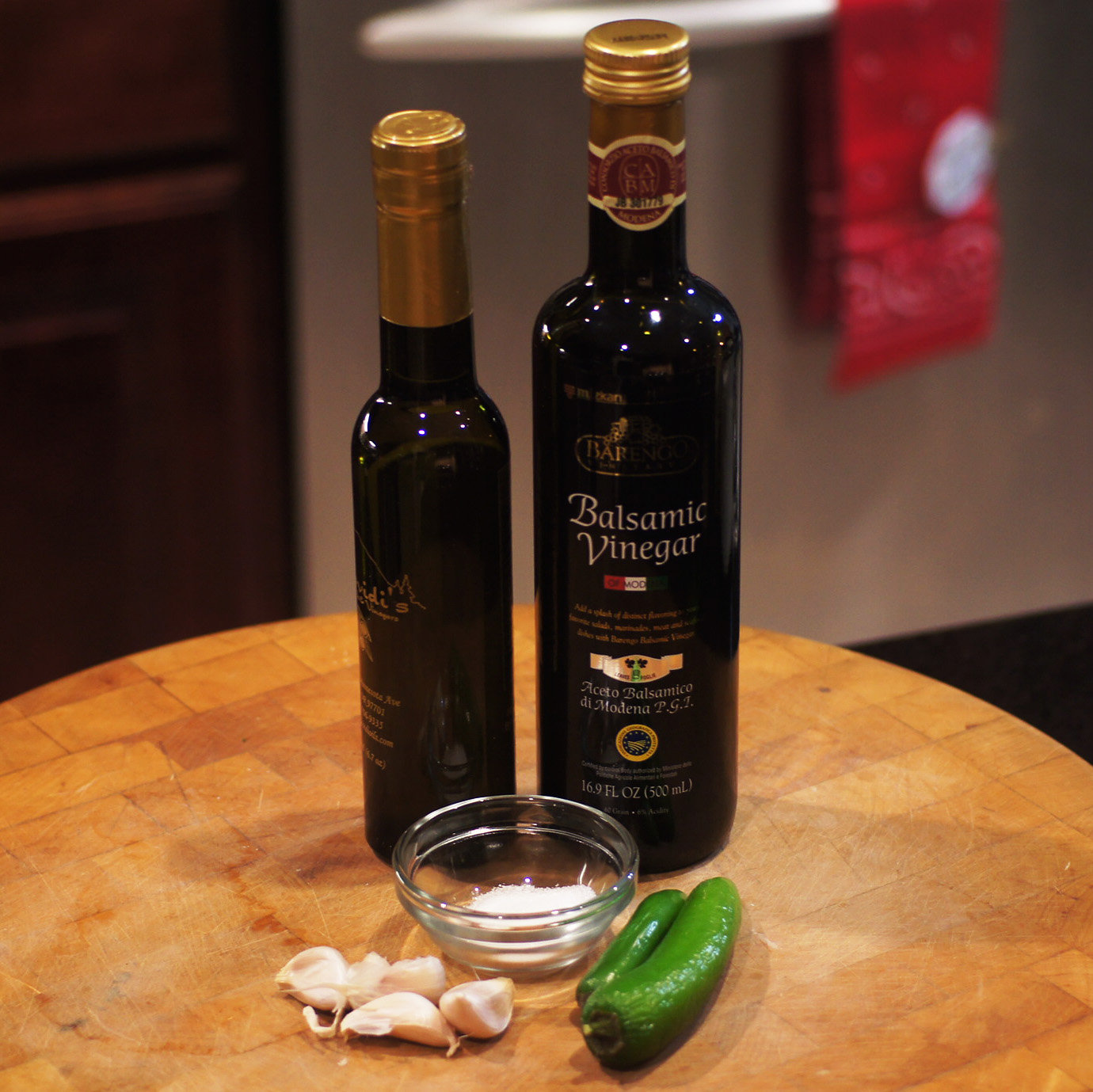 This is a spin on a Rick Bayless recipe. We really like his approach to Mexican food and regularly watch his show Saturdays on PBS. One Saturday we were watching his show and we saw his Chayote Salad. Now, I ike chayote but had never considered making a salad; so, I was intrigued. What really caught my attention, however, was the Roasted Serrano, Garlic, Balsamic Vinaigrette. It sounded out of this world and is. It has the sweetness and tartness from the balsamic vinegar coupled with the savoriness from the garlic, olive oil and the roasted Serrano chiles that also add that little extra kick of heat. Not only is this dressing wonderful on the chayote salad but it is remarkably versatile. You can use it with boiled/broiled shrimp, fish, vegetables, etc. I add it to Quicksteps sandwiches either as a drizzle or mixed with the mayo to make a wonderful sandwich spread. We like this dressing so much that we make double batches and it is a regular condiment in the fridge. It really is that good. Give it a try. We know you will like it. Here is what we did.