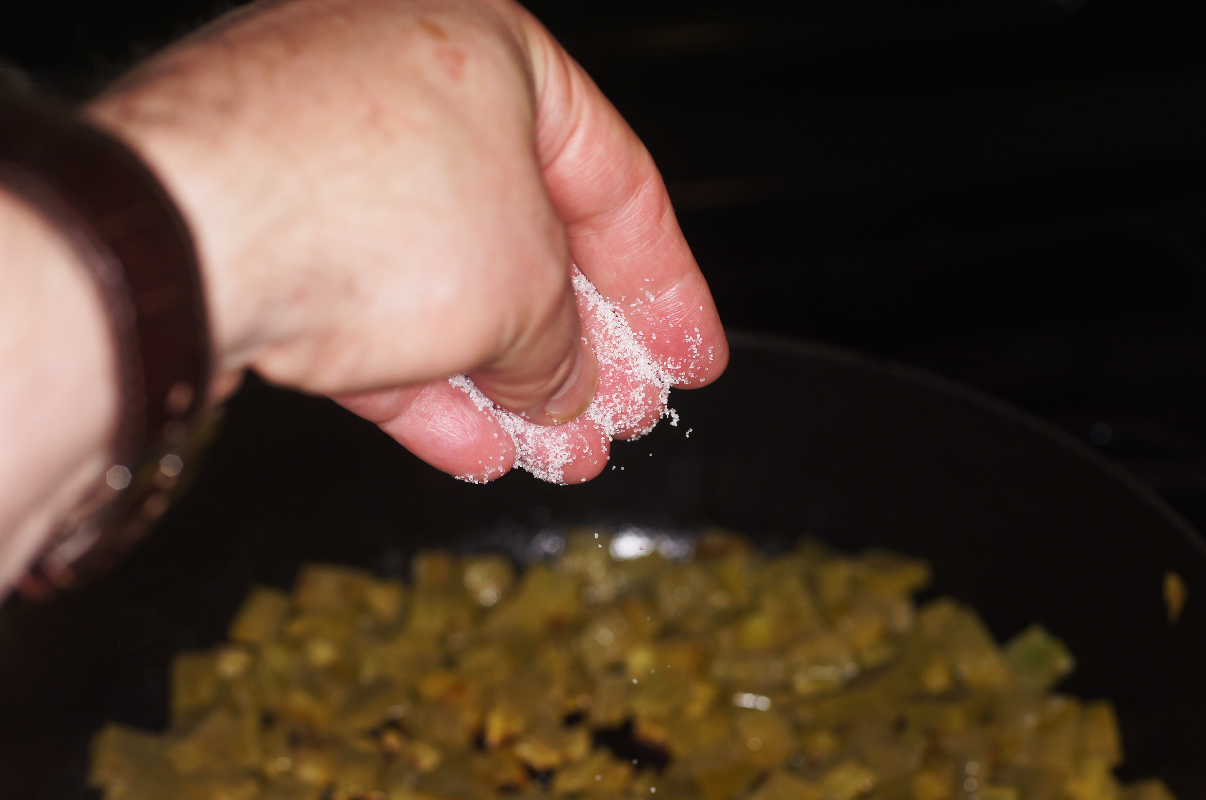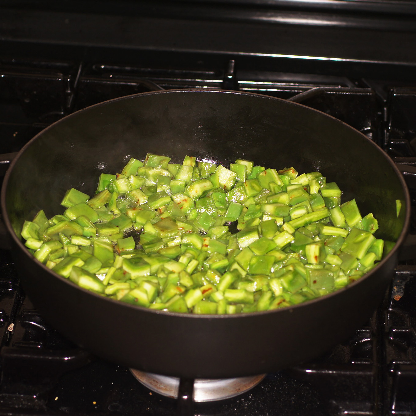 Notice the nopales are slimy kinda like okra? The trick to nopales is to cook them long enough to get rid of the slime. This is done one of a couple of ways. You can boil them or you can sauté them like in this recipe. Stir the nopales for a couple of minutes and let them sauté.