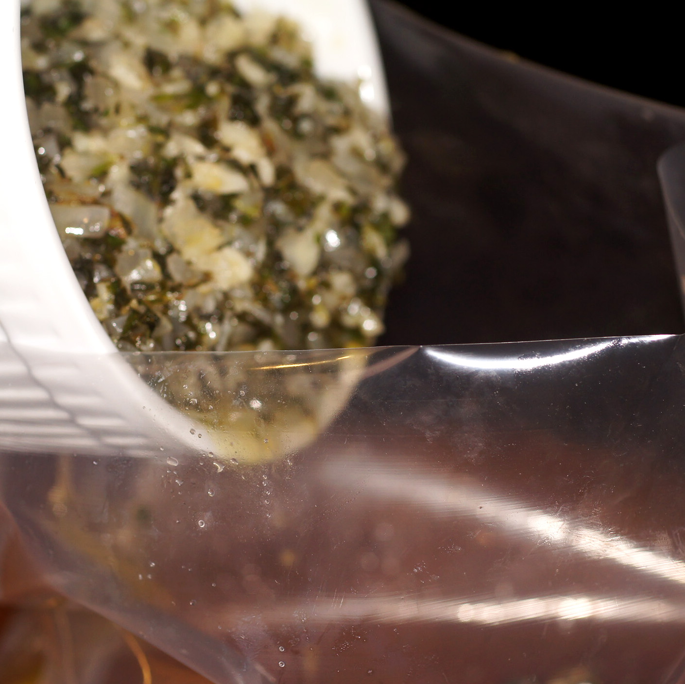 Next, cut the ocotpus’ legs off the head into 8 separate pieces – its an  octopus meaning eight feet – and cut the head in half longitudinally (It’s a really big octopus). Now, put the octopus in a food safe, sealable, plastic vacuum bag and add 1/2 cup olive oil and a handful of fresh oregano. Seal and place in the sous vide at 74 C/165 F.
