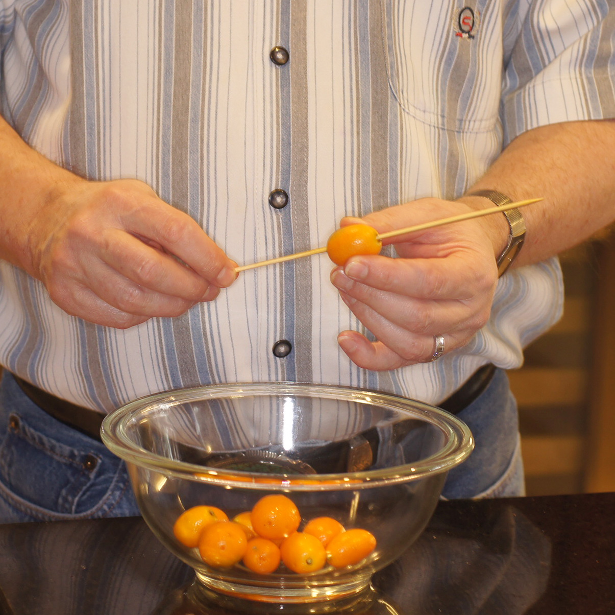 Get a toothpick, skewer, etc. and poke 5 – 6 holes in the kumquats. This allows the seasoning to permeate the skin of the kumquat into the fruit.