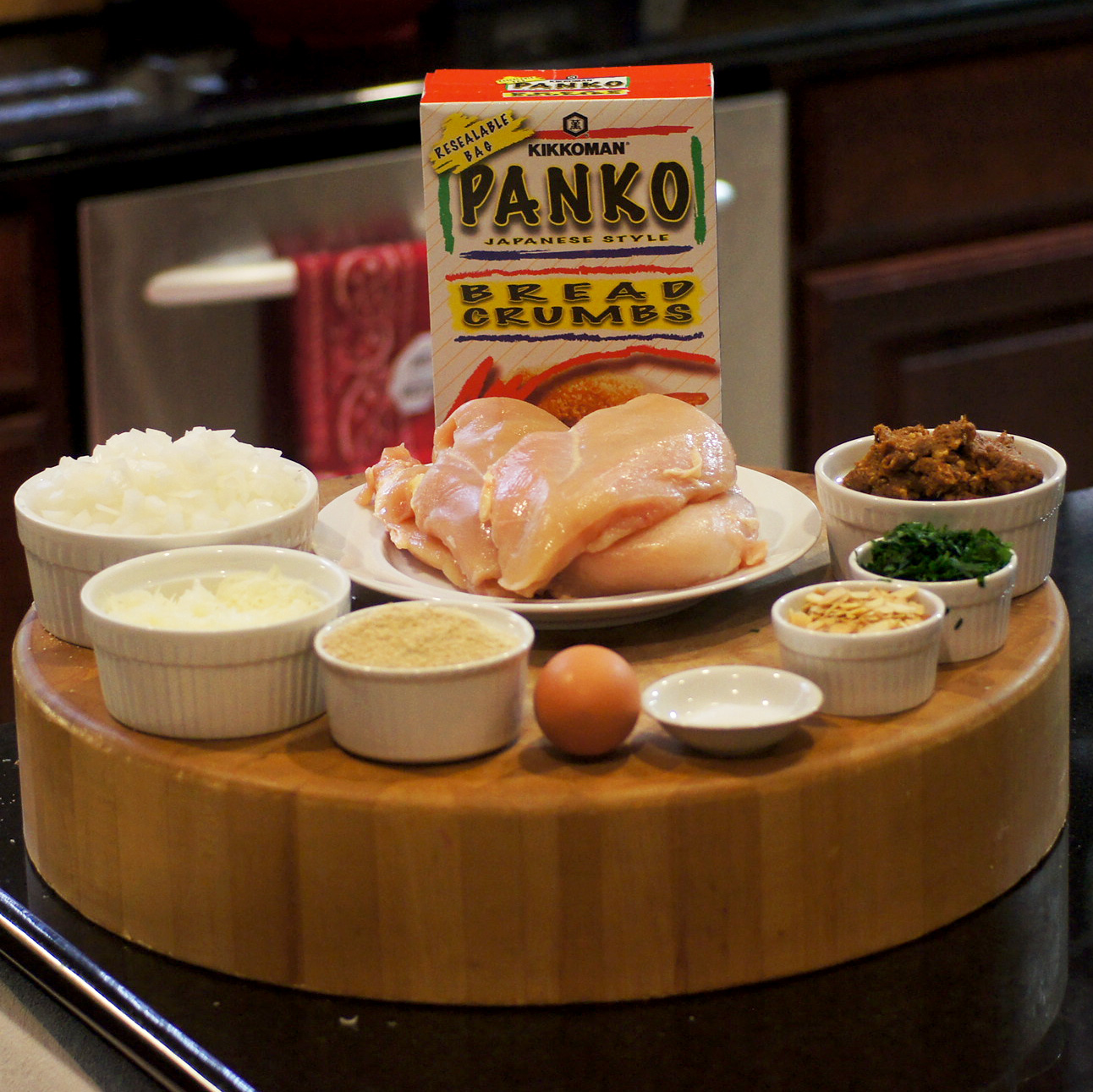 Ah, the joys of beating a helpless piece of meat. 🙂 You want to pound the chicken so that it is roughly 1/4″ thick. Cover and set aside in the fridge until you’re ready.