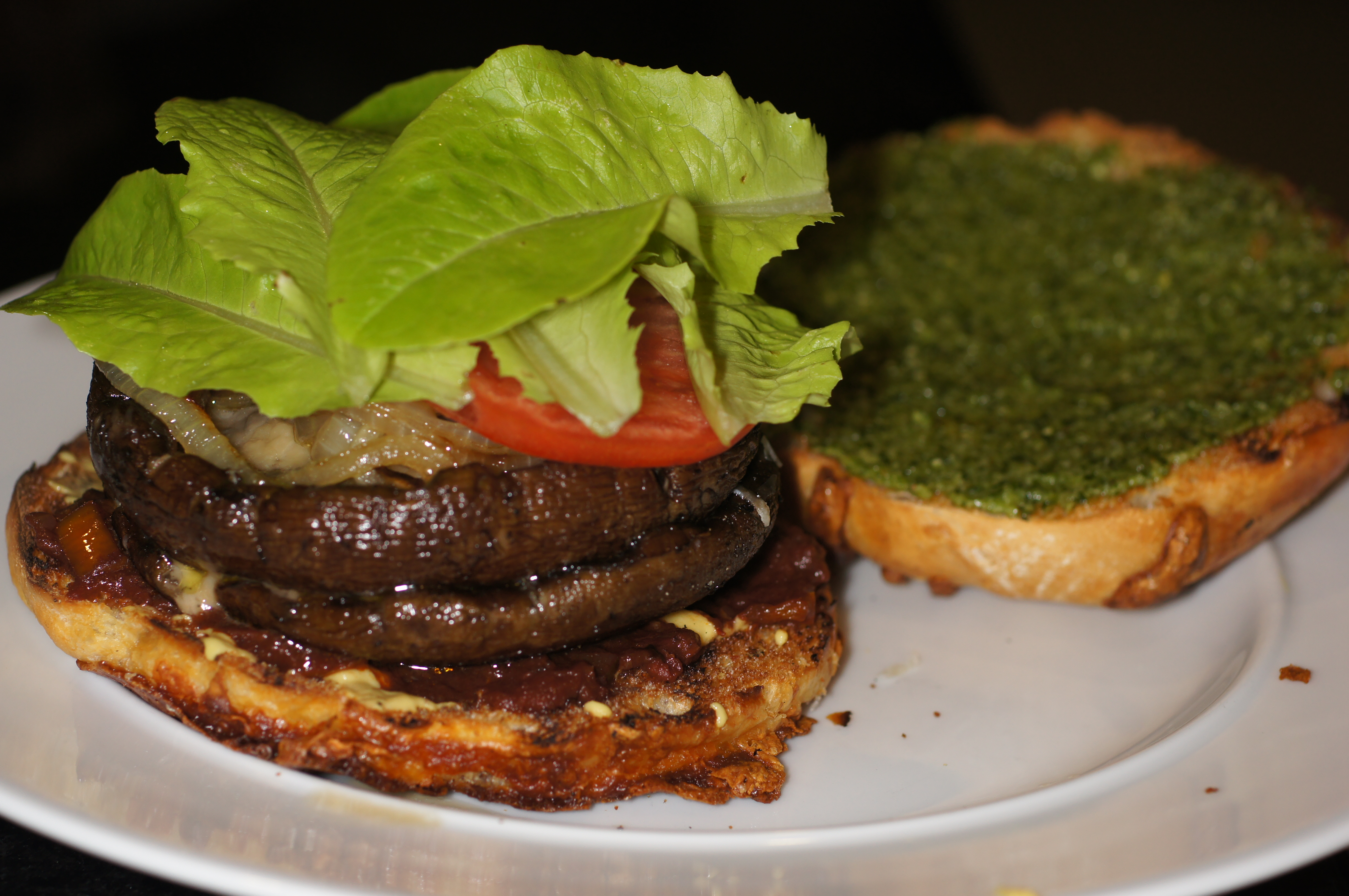 Mushroom Burger with Italian Red Sauce, Pesto, Carmelized Onions, Provolone and Parmesan Cheeses on a Kaiser Roll