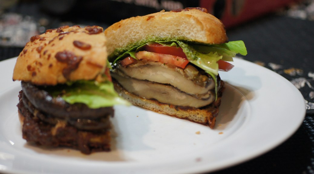 8 or 9 years ago on business I was traveling in St. Louis. It was late. The restaurant I wanted to go for dinner was closed that evening and I had an early day the next morning. So, I went to a local grill on a flyer. I don’t even remember the name and never went back. Nothing on the menu appeared appetizing so I settled on the portobello burger. It was the best part of the trip! Continue reading Mushroom Burger with Italian Red Sauce, Pesto, Carmelized Onions, Provolone and Parmesan Cheeses on a Kaiser Roll